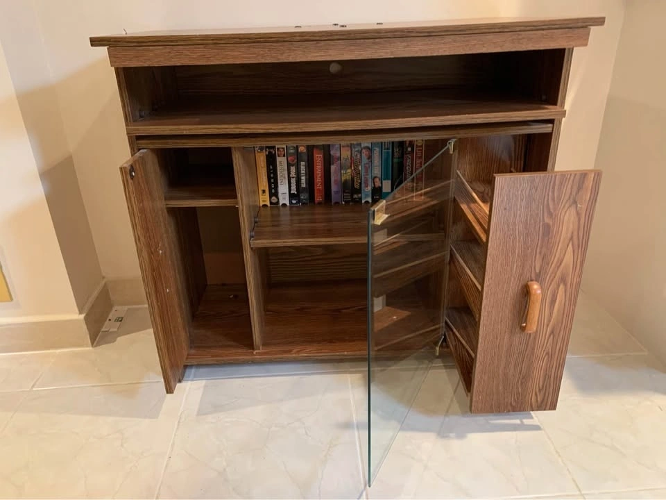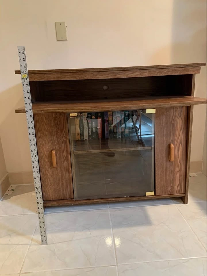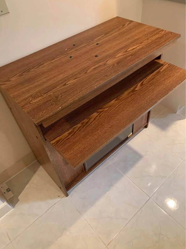 Sturdy good quality tv stand can also be used as desk, has pull out for key board. Please look at all pics to get full idea of item.