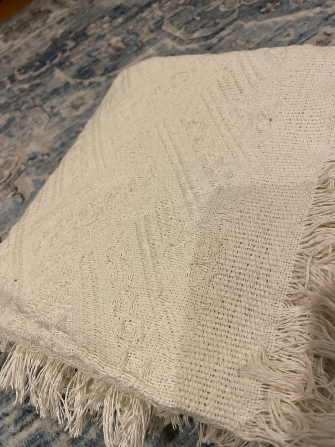 Selling a small cream throw blanket with fringe detailing! It's in great condition and would look lovely draped over a sofa or chair. Perfect for adding a cozy touch to your space
