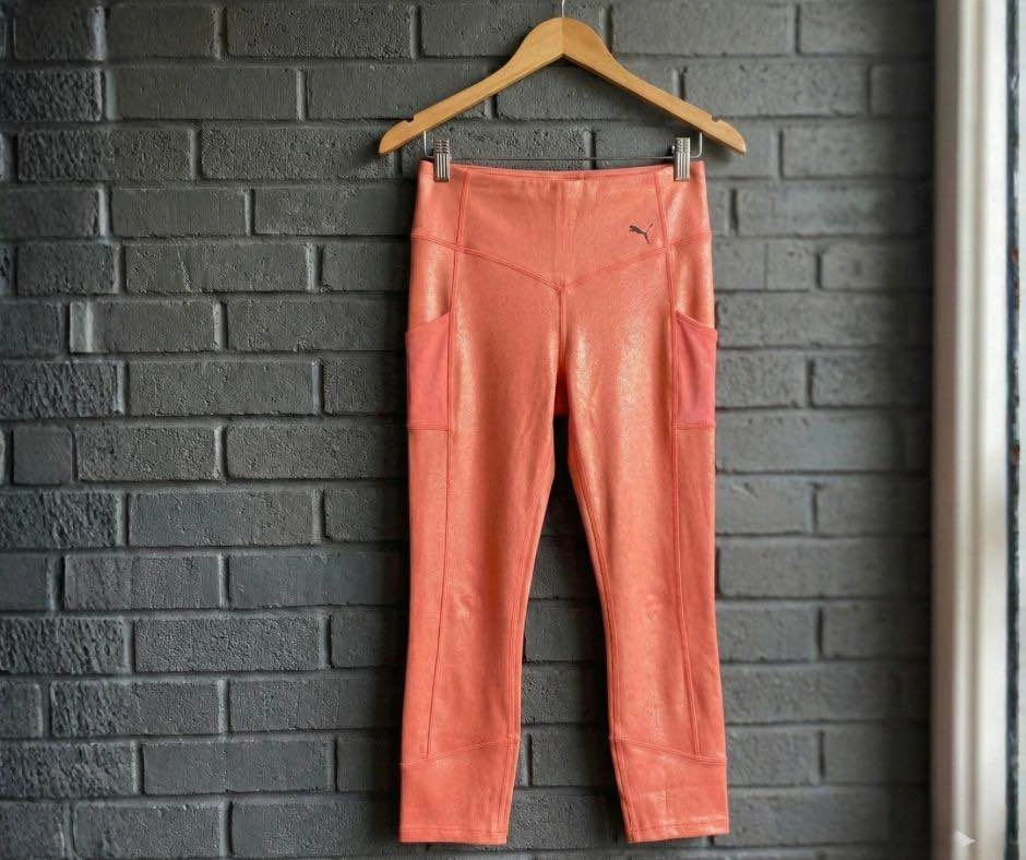 Selling a pair of PUMA leggings (SMALL SIZE) in a unique metallic coral color. These feature a subtle shimmer that looks great in person.