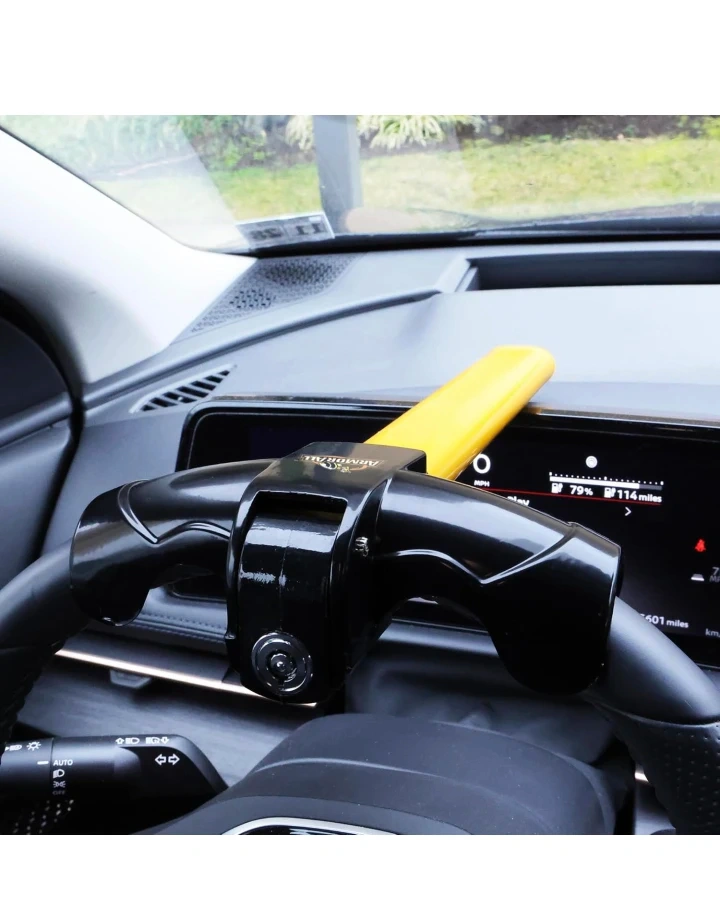 Keep your car safe with this Armor All steering wheel lock! It's designed to prevent the steering wheel from being turned, offering a simple and effective anti-theft solution. The lock fits on most vehicle steering wheels and features a heavy-duty locking mechanism with carbon steel construction. It also has a vinyl coating to protect your car's interior. Easy to use and install, and it comes with two keys!
