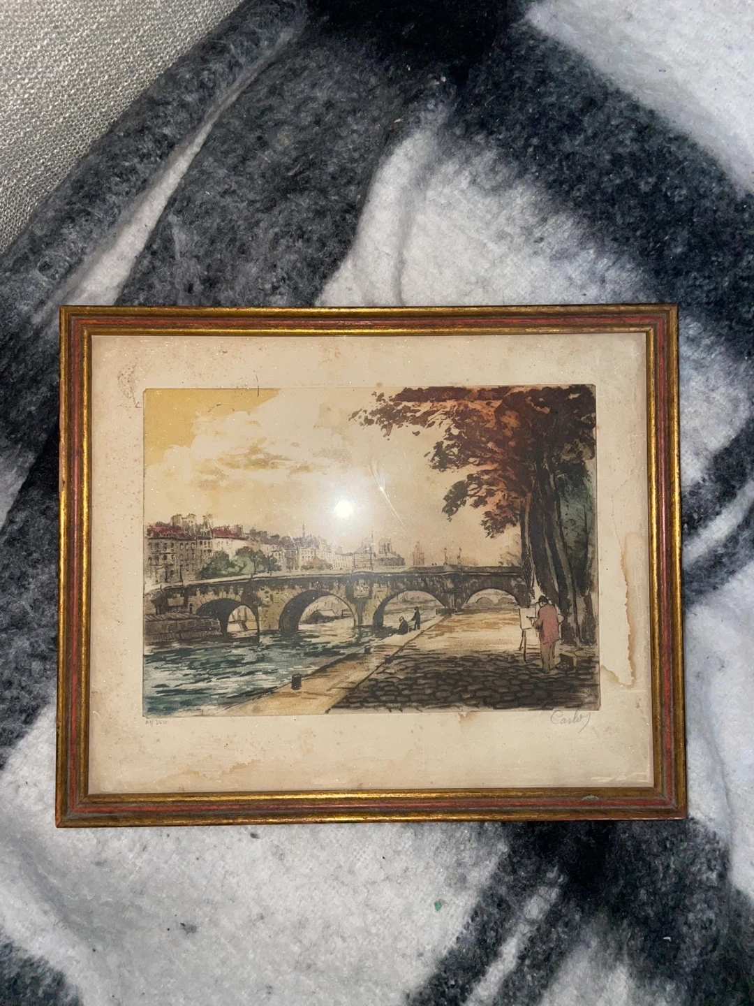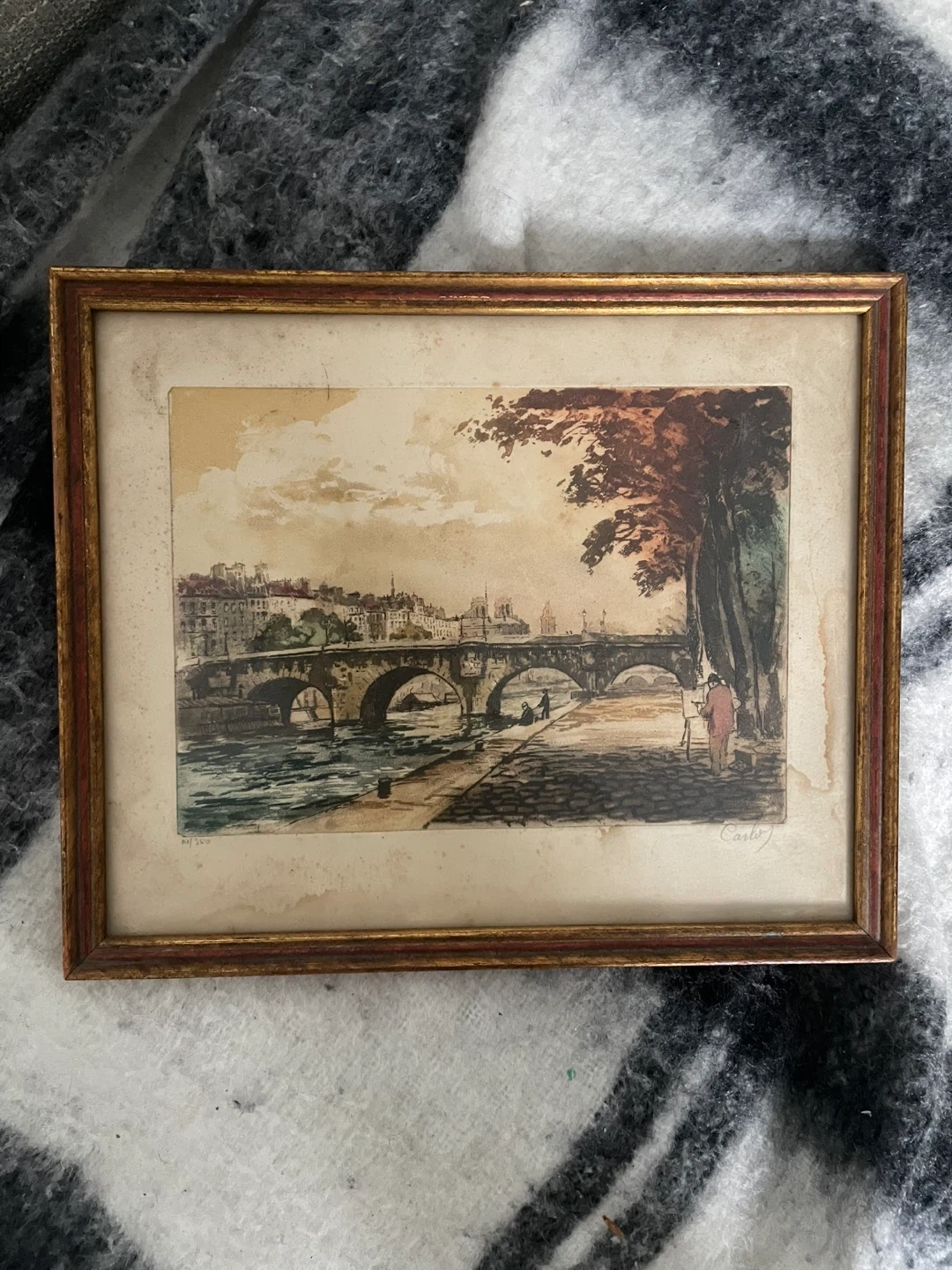 Here's a vintage framed print featuring a charming scene of a bridge in Paris! It's got a lovely, classic look that would add a touch of elegance to any room. The frame has a gold and red tone. Perfect for adding a bit of Parisian flair to your home decor. Only selling because I’m moving countries.