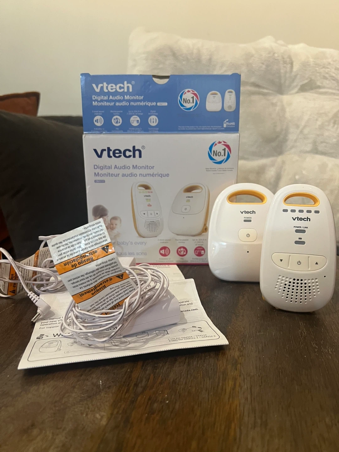 Selling a VTech DM111 digital audio baby monitor. It comes with the box and all the original components. Keep an ear on your little one with this handy audio monitor!