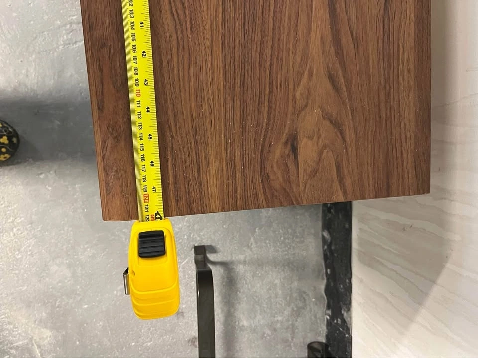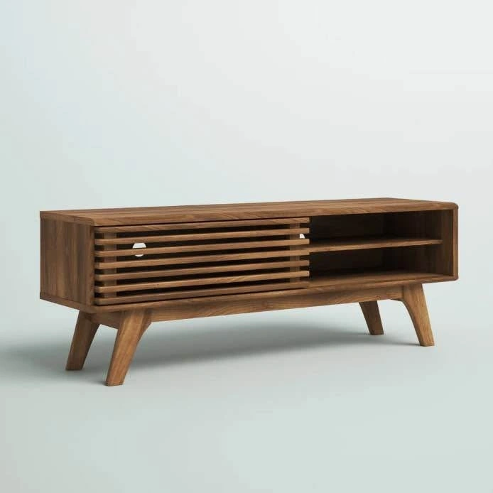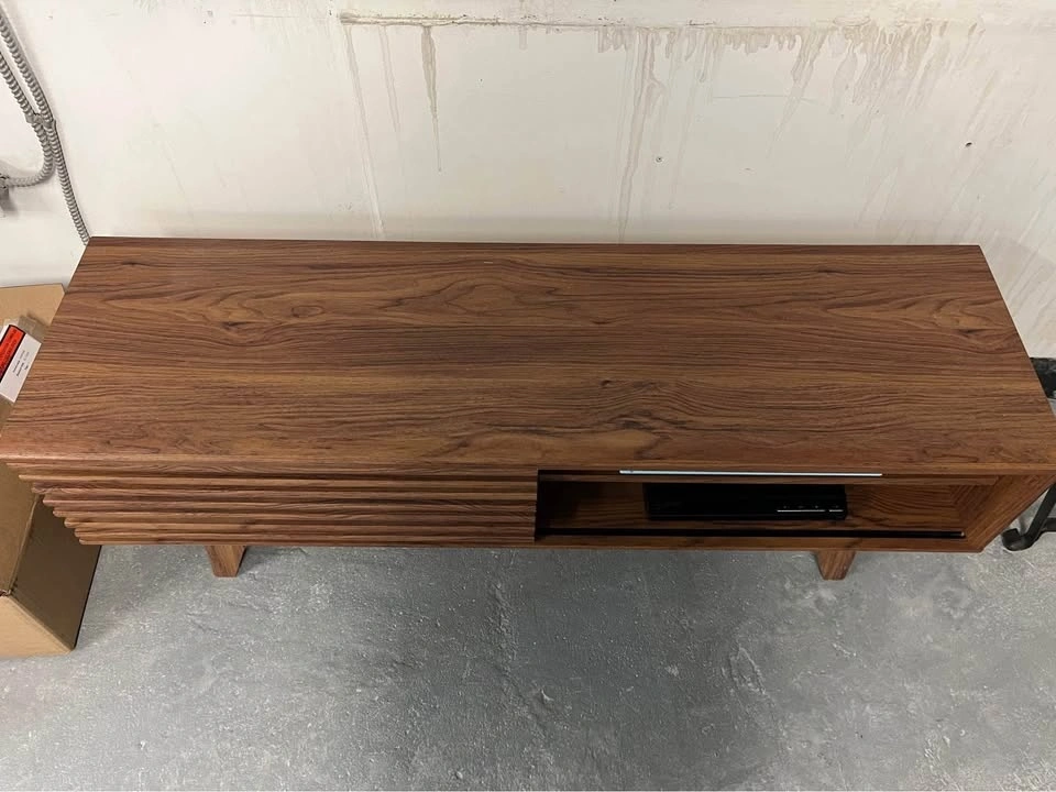 Render mid-century modern 48” TV stand. Particle board frame with smooth walnut grain laminate, four tapered legs and a sliding slat door for storage. Has cable management hole in back on both sides. High end looking. Available for sale on Wayfair for $251.69