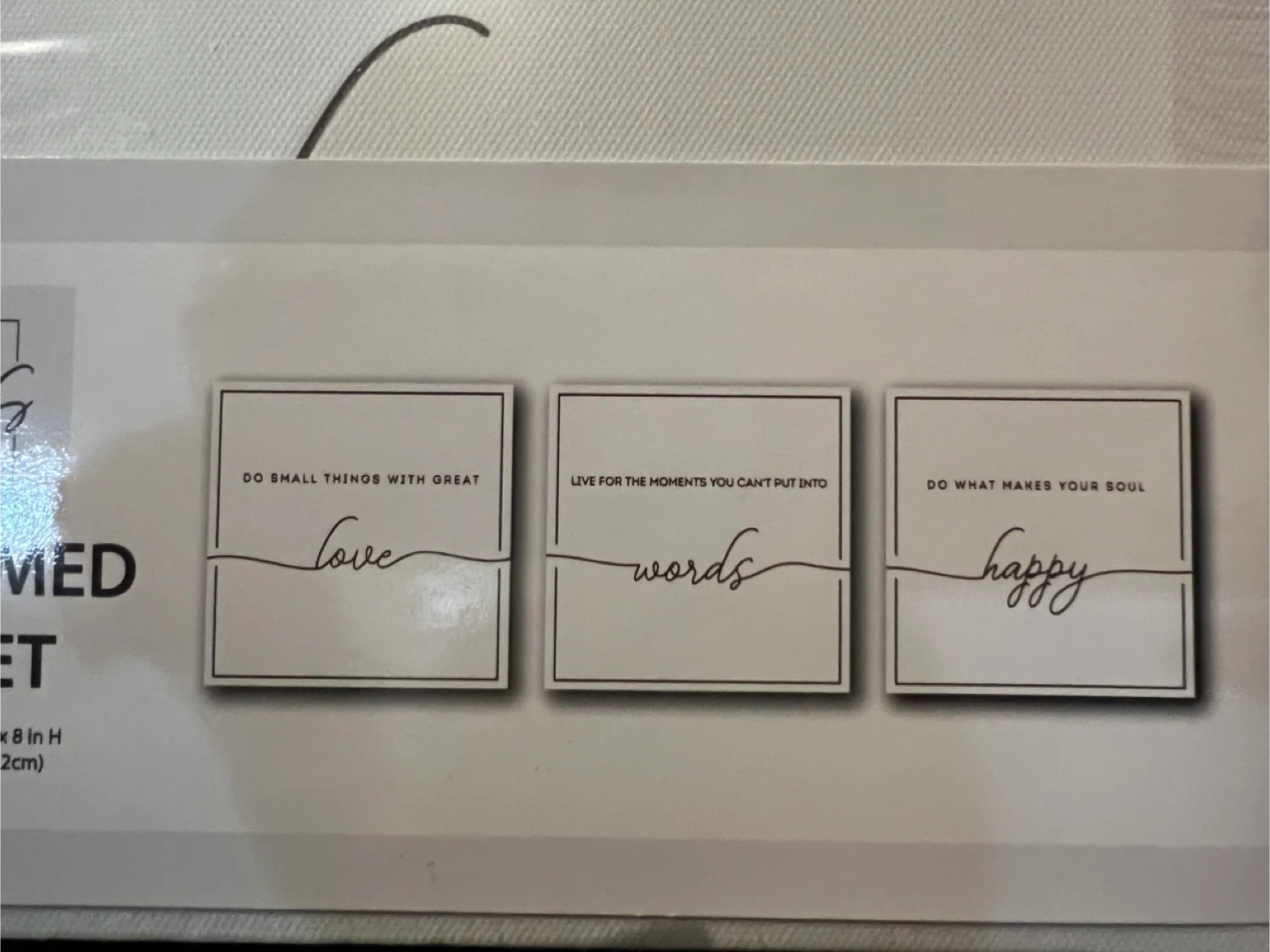 Selling a brand new, still-in-packaging Words to Live By 3-piece framed art set! The set includes three framed pieces with inspirational words: love, words, and happy. Each frame measures 8 inches in length, 0.7 inches in width, and 8 inches in height.