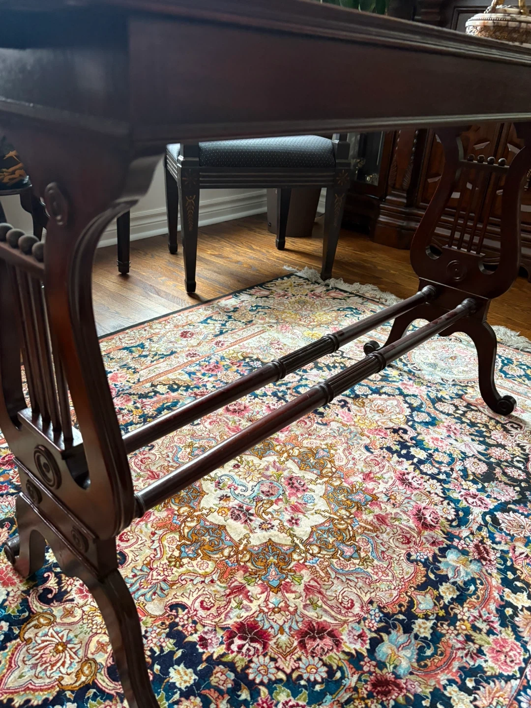 Selling a vintage mahogany lyre table. It's a beautiful piece of furniture with a unique design. The table is in good condition and would make a great addition to any home!