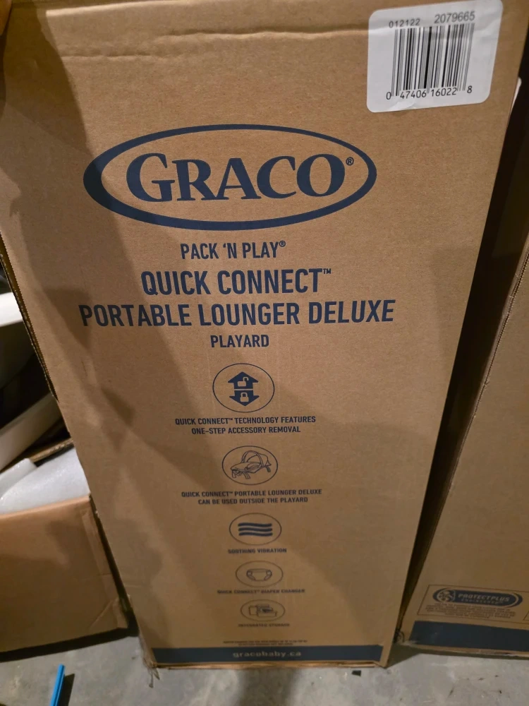 Selling a Graco Pack 'n Play Quick Connect Portable Lounger Deluxe Playard! This playard features quick connect technology for one-step accessory removal. The portable lounger deluxe can be used outside the playard. It also has soothing vibration