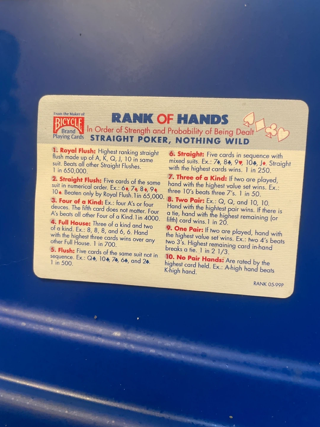Gameplay: Players match cards called out by a dealer to the cards printed on their personal boards, aiming to cover five in a row horizontally or vertically, similar to bingo. The winning rows often correspond to different poker hands, which can be used for various scoring methods.