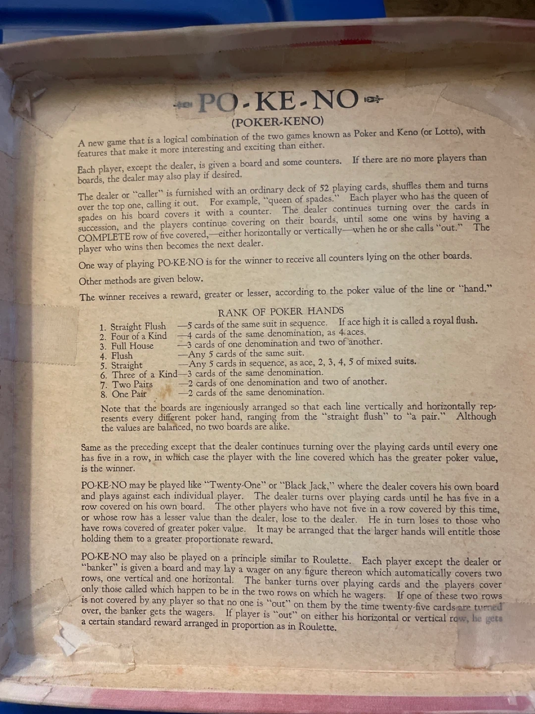 The item shown in the image is a vintage Po-Ke-No (Poker-Keno) board game set. This game is a combination of poker and bingo (or keno) mechanics and was originally created by the U.S. Playing Card Company in 1930. The box states it is a "12 Board Set".