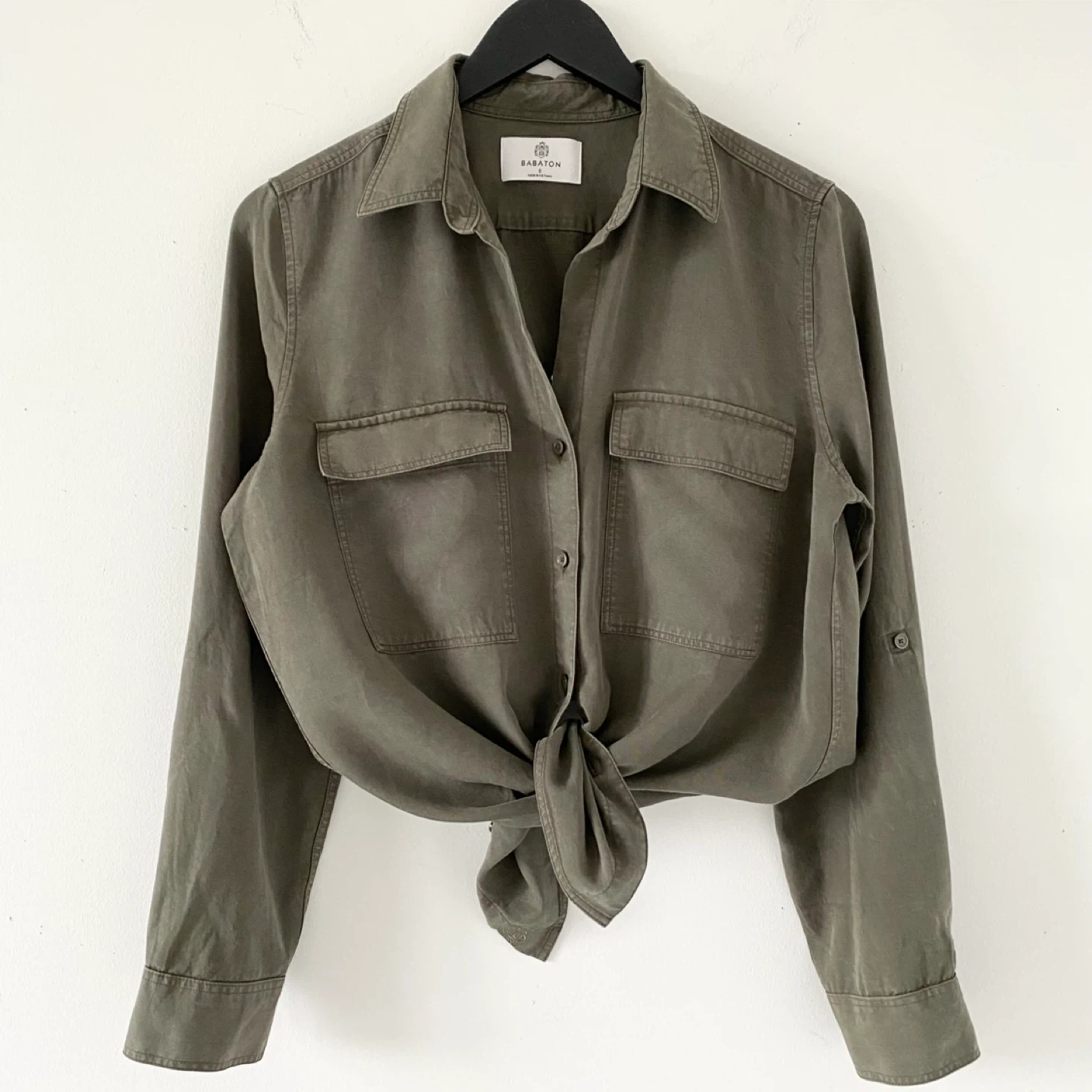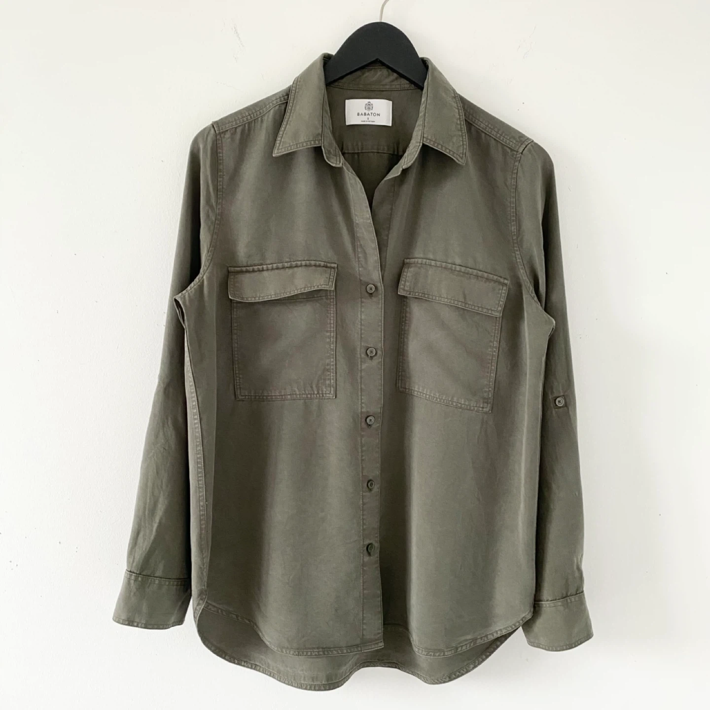 Aritzia Babaton utility shirt. Features a relaxed fit, patch pockets and tabs to keep sleeves rolled-up. It's made from 100% Lyocell - responsibly sourced wood-based fibres. It's soft and drapes so beautifully. Can be worn many seasons. Well made - inside seams are finished with french seams for extra clean finish and quality. There’s no staining or damage. It's clean and in excellent condition.