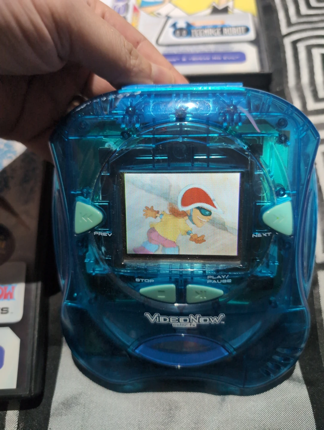 Selling a VideoNow Color personal video player with 7 included discs! It's in good working condition and ready for a new home. The discs include titles like Yu-Gi-Oh, Rugrats, Hilary Duff, My Life as a Teenage Robot, Spongebob Squarepants, Rocket Power, and The Burrows