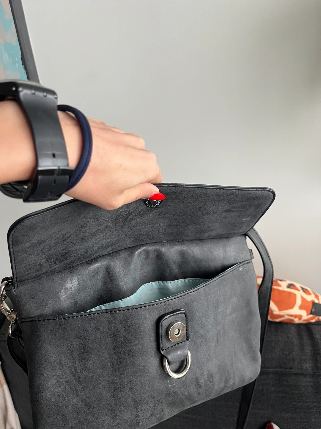 Selling a black crossbody bag from Nicole Miller New York. It features a zipper closure and a front flap with a magnetic snap. The interior is lined with a light blue fabric. Slight yellowing in the inside but doesn’t affect outer appearance