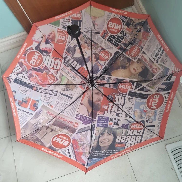 Here's a fun umbrella featuring a newspaper print design with the Toronto Sun logo and various articles and images! It's in great shape and ready to keep you dry on those rainy days