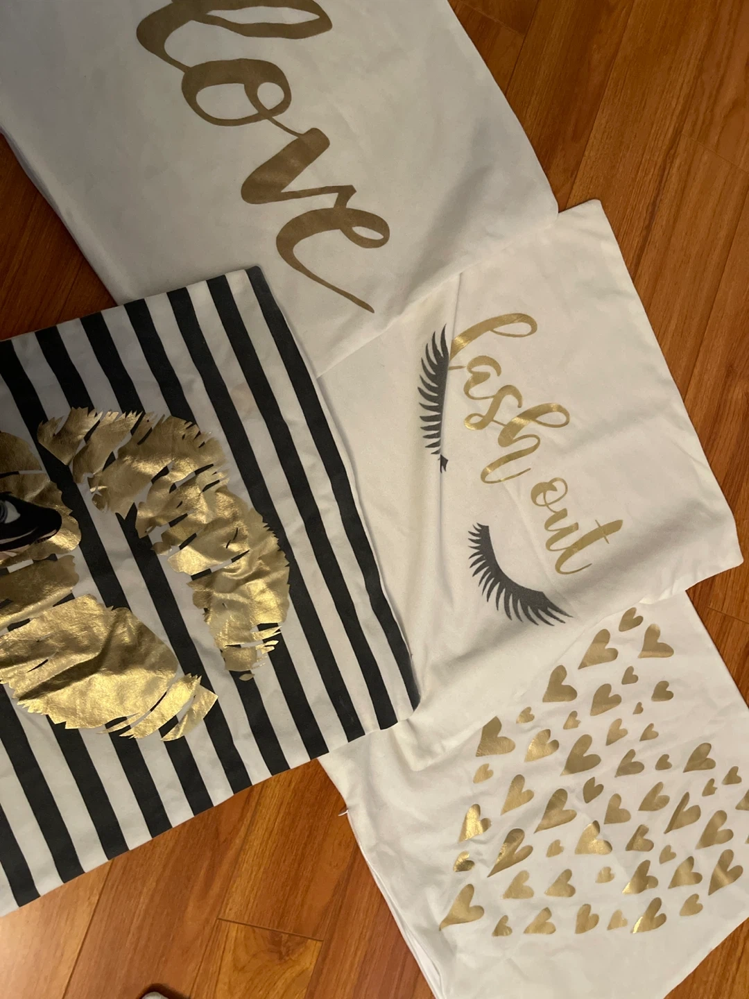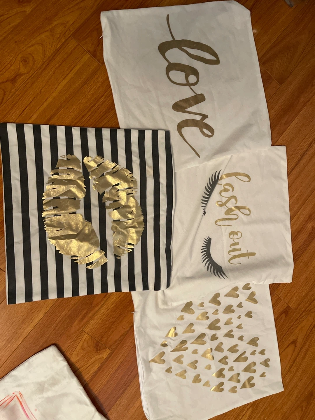 Selling a set of four decorative throw pillows! They feature unique designs like stripes, hearts, and eyelashes. Perfect for adding a touch of style to your living room or bedroom. In great condition!
