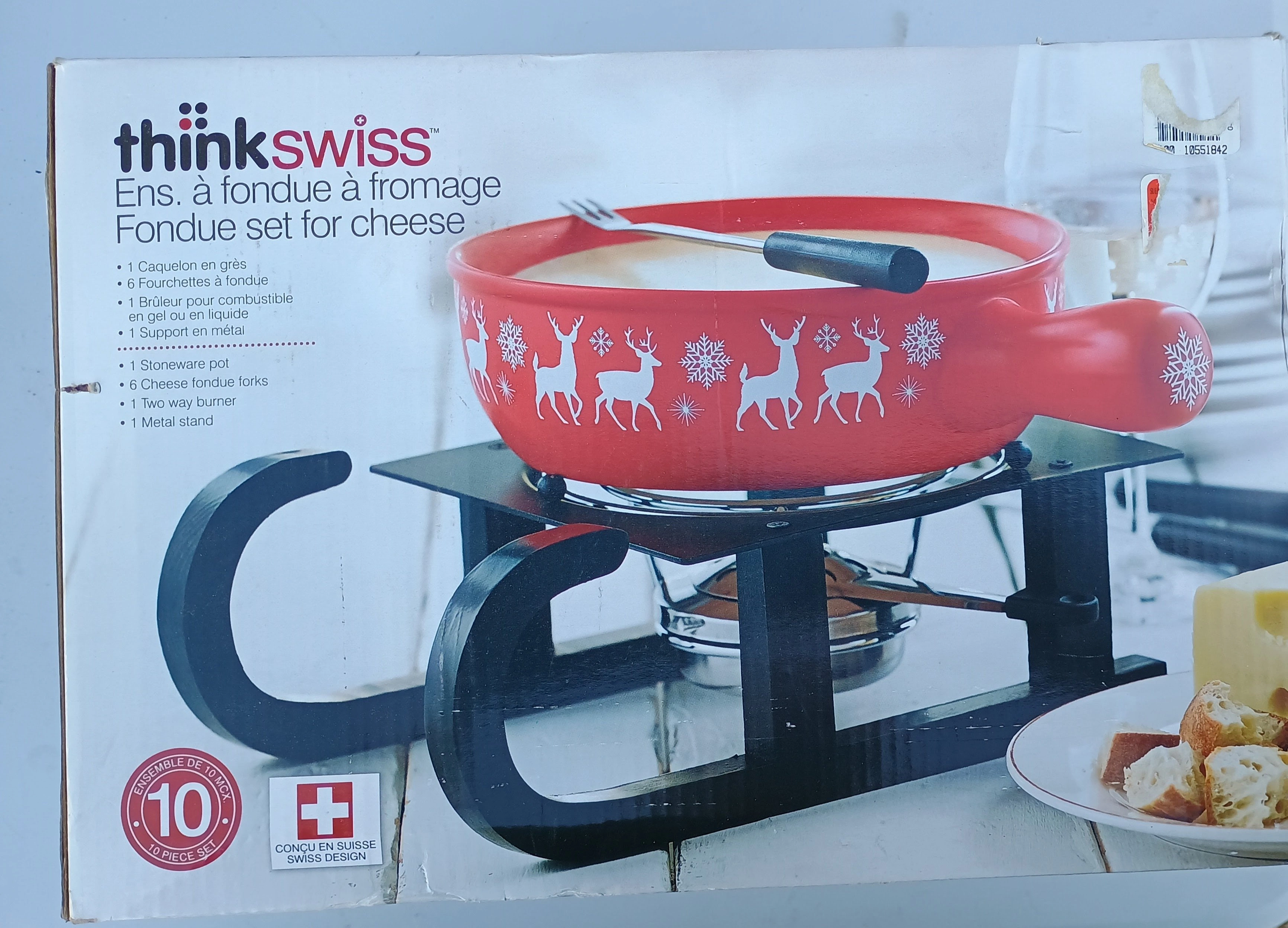 I have for sale, new in box, never used, a Thinkswiss brand cheese fondue set. Includes stoneware pot, 6 forks, fondue fuel burner, and metal stand. I'll even throw in a bottle of fondue fuel if you like.