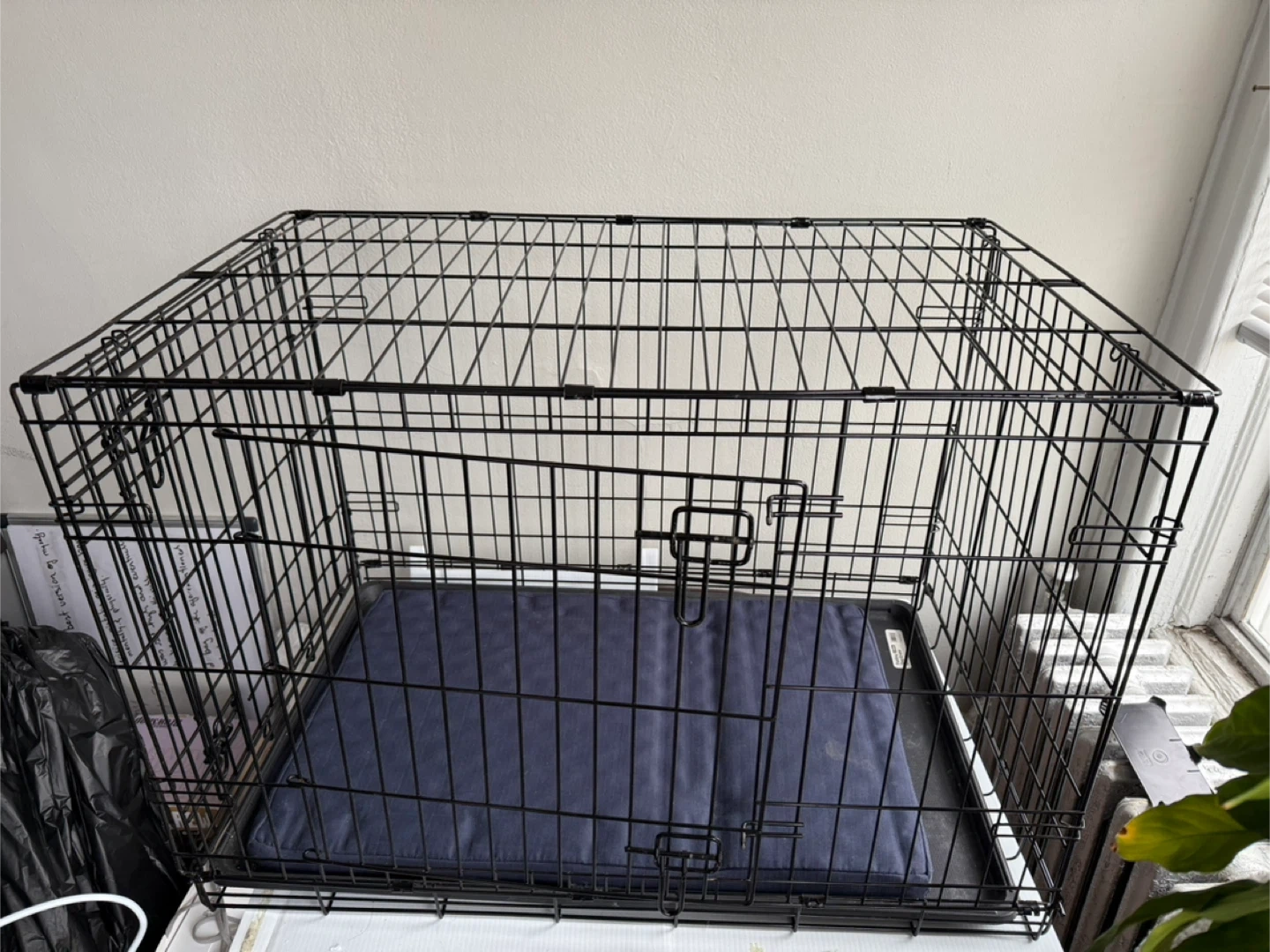 Selling a foldable black dog crate! It's in great condition and includes a blue cushion. Perfect for providing a safe and comfortable space for your furry friend. It has 2 doors and is approximately 35.5 x 22.5W x 24H.