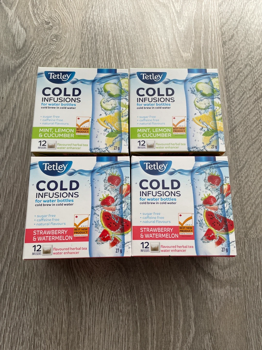 Selling four boxes of Tetley Cold Infusions for water bottles! Two are Mint, Lemon & Cucumber and two are Strawberry & Watermelon. Each box contains 12 flavourful herbal tea water enhancers that are sugar and caffeine free.