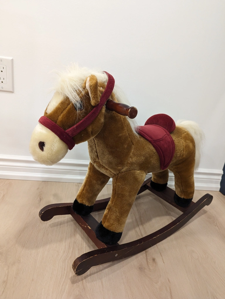 Here's a cute plush rocking horse! It's in good condition and ready for a new home. It features a soft plush body and a sturdy wooden frame, perfect for hours of fun