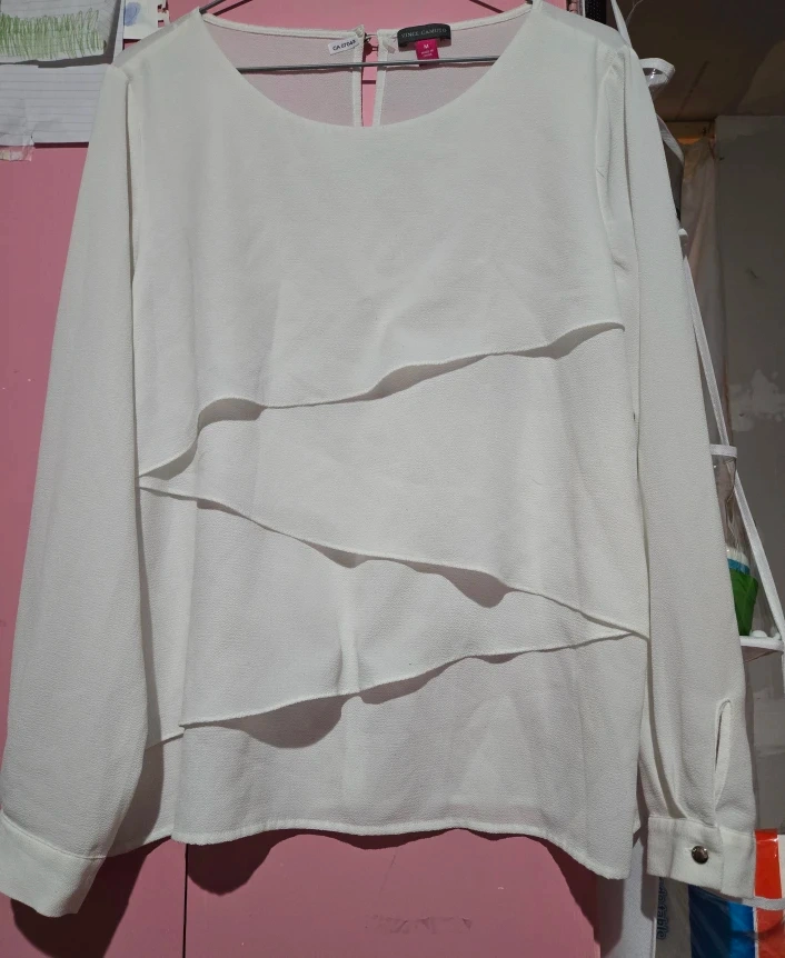 Here's a lovely Vince Camuto blouse in size medium! It's a beautiful white colour, perfect for dressing up or down. The blouse features a unique layered design on the front, adding a touch of elegance to your outfit.