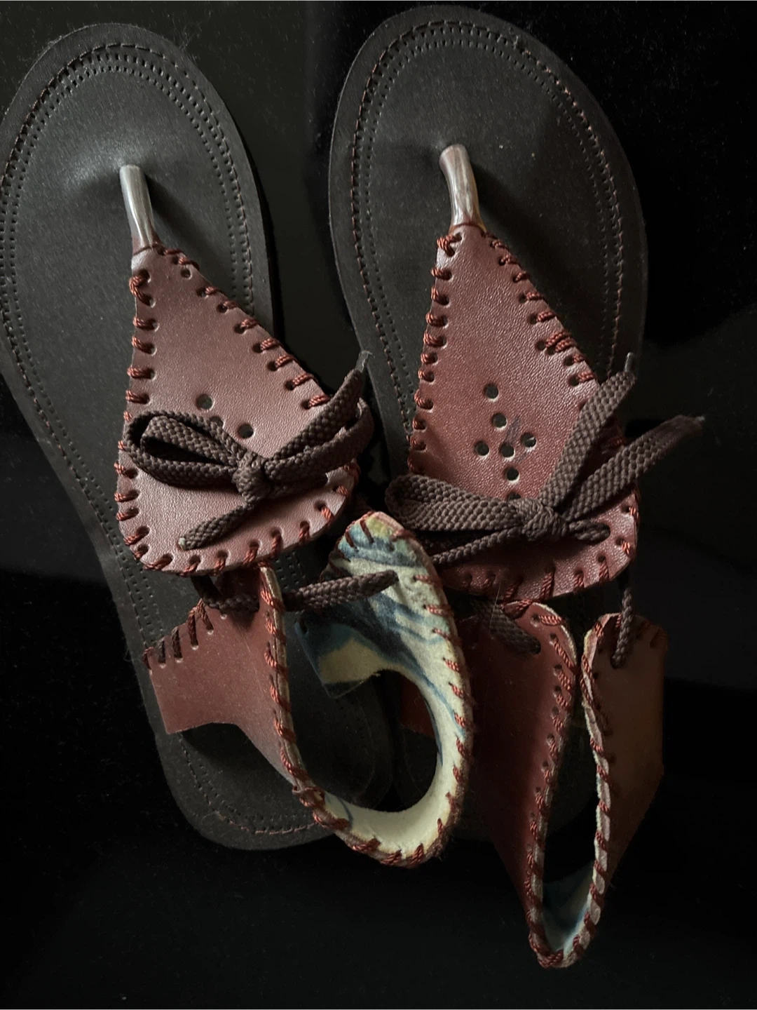 These brown leather thong sandals are super cute and comfy! They feature a unique design with decorative stitching and tie detailing. Perfect for adding a touch of style to your summer wardrobe