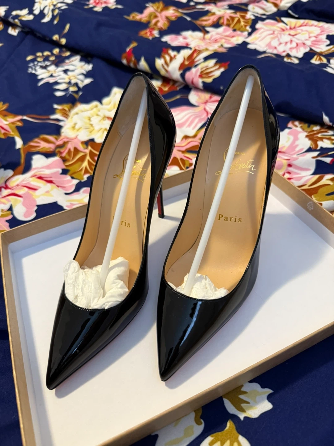 Selling a pair of Christian Louboutin heels in black patent leather. They are in excellent condition and come with the original box. Perfect for a night out or special occasion!