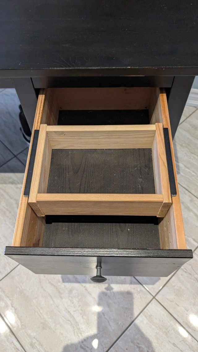 The desk is IKEA highest quality wood. https://www.ikea.com/us/en/p/hemnes-desk-black-brown-light-brown-30535048/ If interested please text me 4169095569