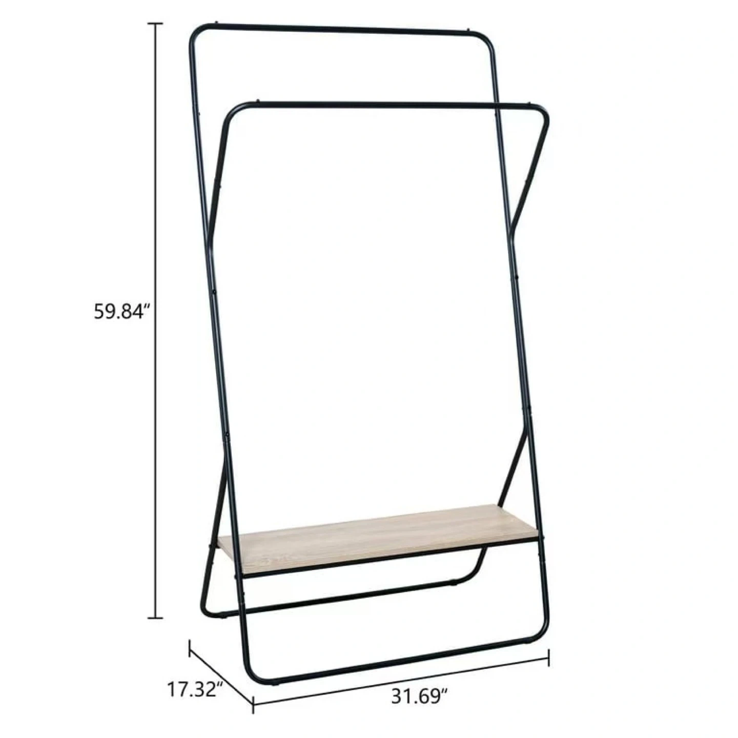 Declutter your space with this handy clothes rack! It features a sturdy black metal frame and a convenient wooden shelf at the bottom. The rack is 152cm tall, 80.5cm wide, and 44cm deep, providing ample space for your clothes and accessories