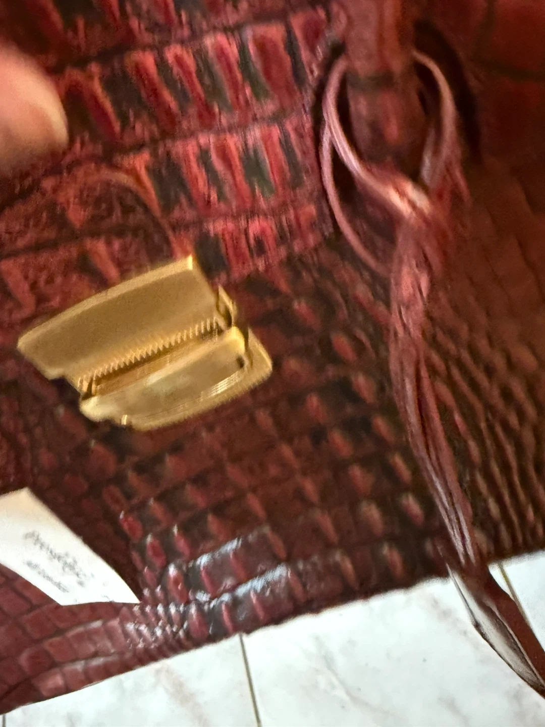 This is a beautiful Preston & York satchel. It features a red leather with a croc embossed pattern. It's in great condition and ready for a new owner!