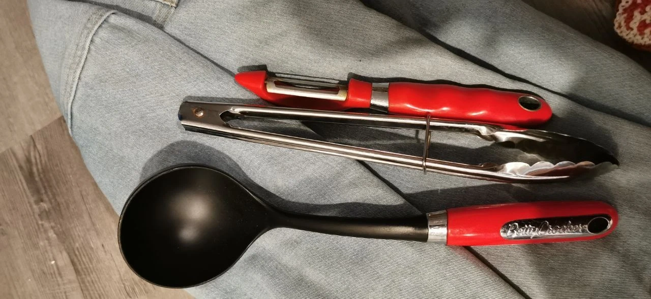 Giving away a set of kitchen utensils. This set includes a ladle, tongs, and a peeler. Perfect for equipping your kitchen with some essential tools.