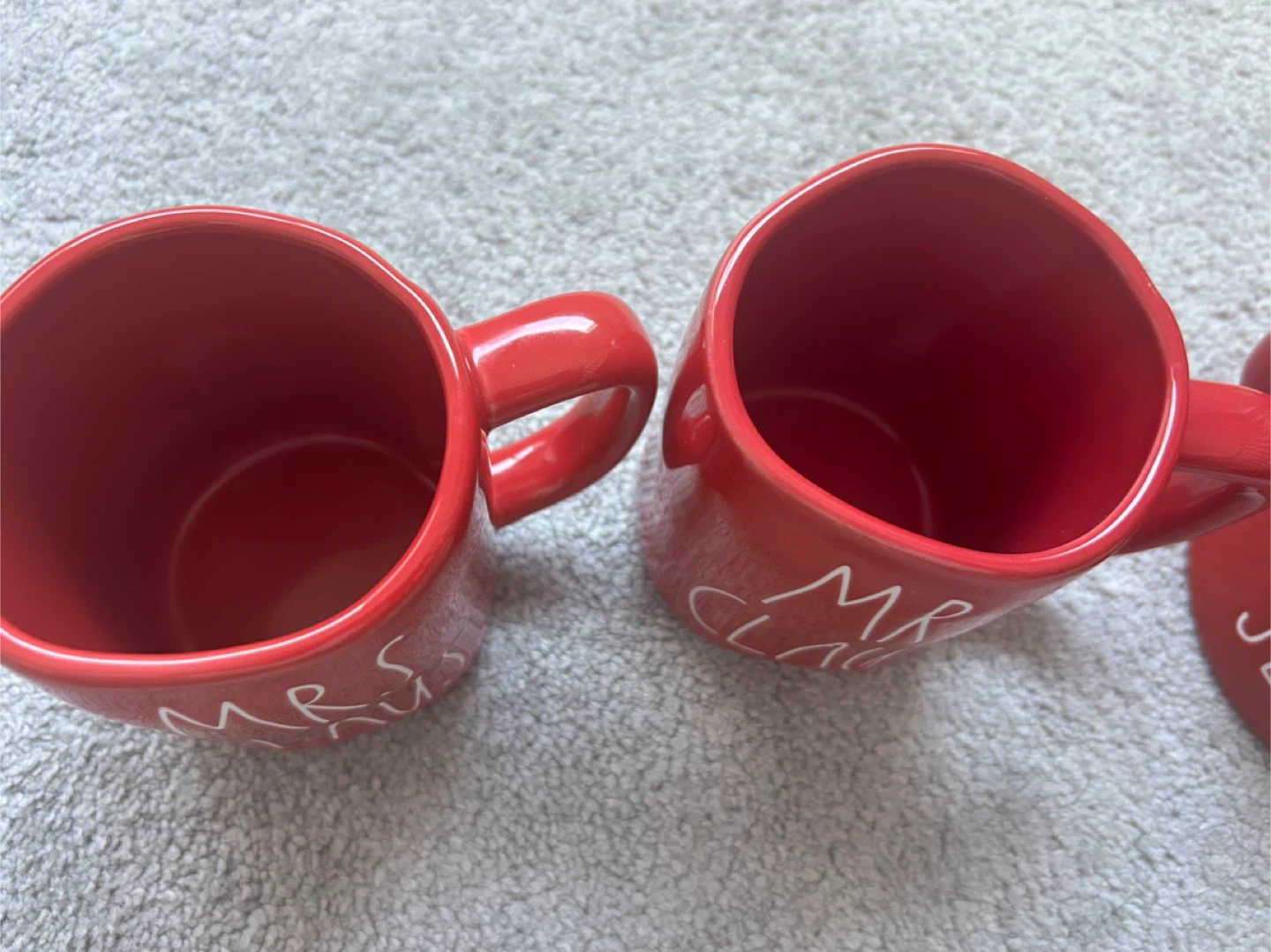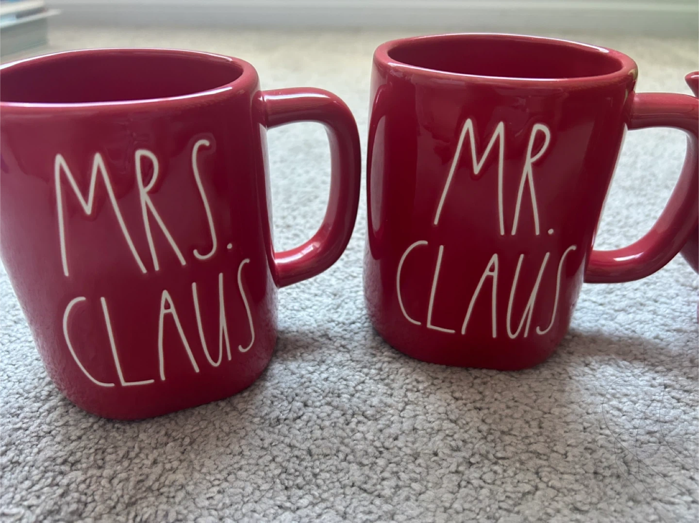 Rae Dunn set including a Mrs. Claus mug, a Mr. Claus mug, and a teapot that says 'Tis the Season' in red with white lettering.