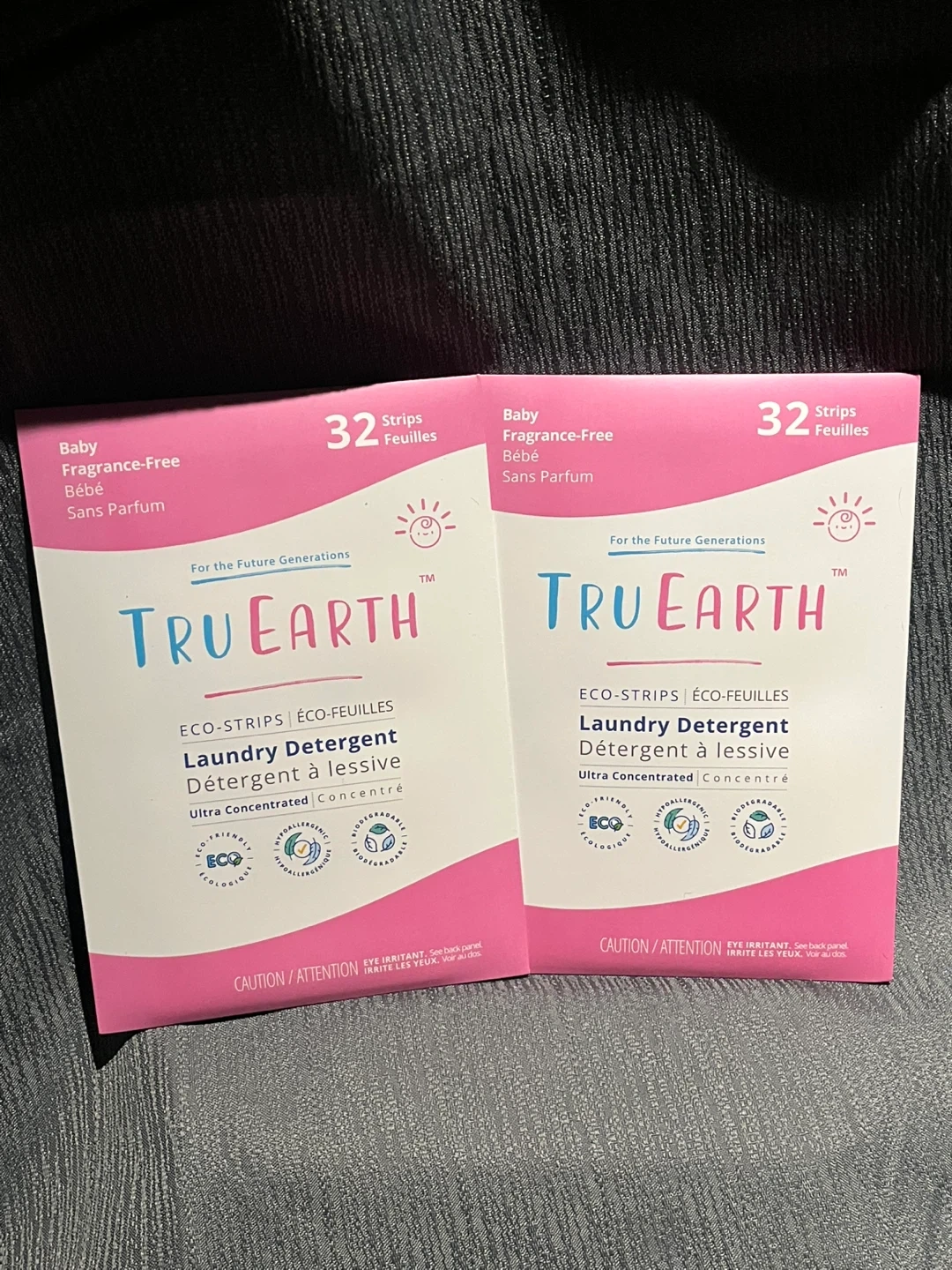 Selling two packs of Tru Earth baby laundry detergent strips. These are fragrance-free and ultra concentrated. Each pack contains 32 strips, making laundry easy and eco-friendly!