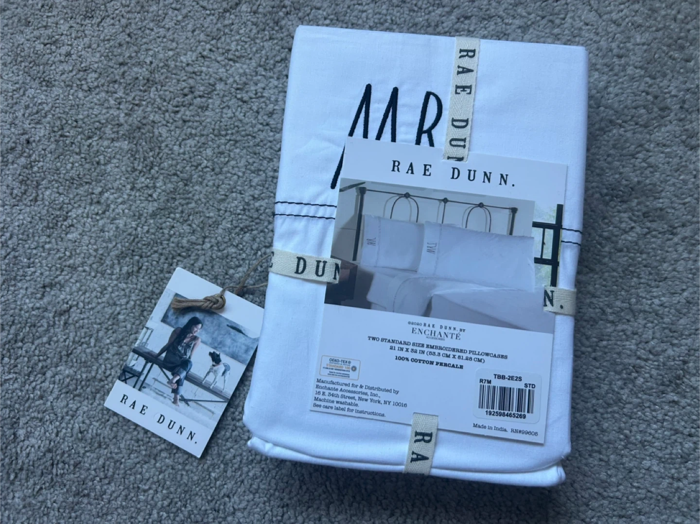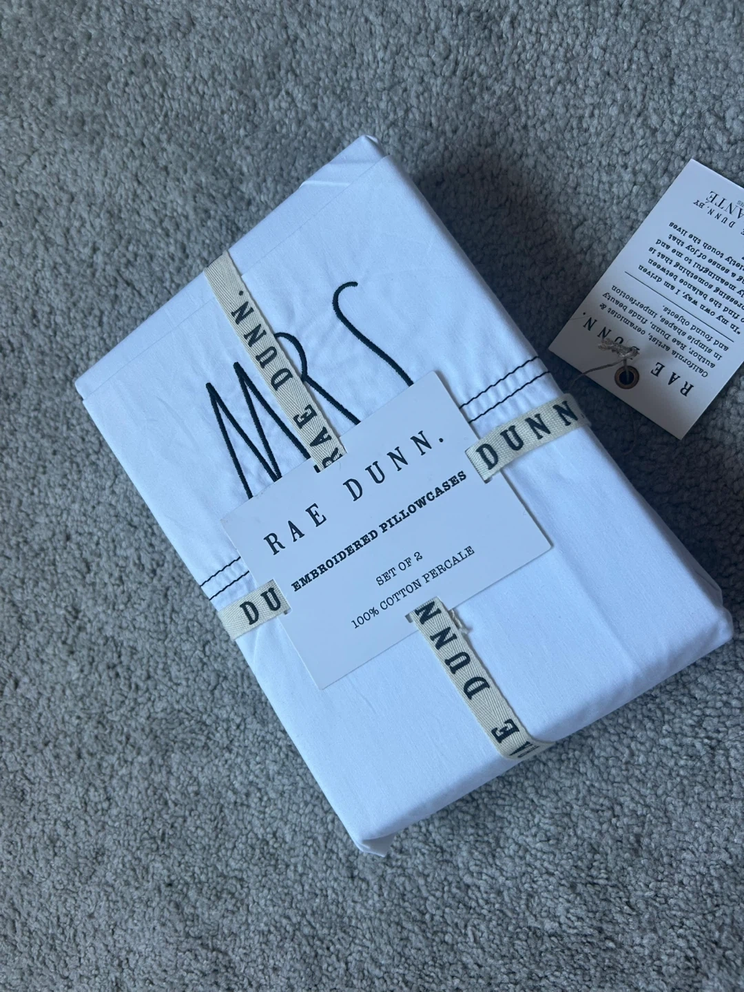 a new set of Rae Dunn embroidered pillowcases! They are standard size, and the set includes two pillowcases. The pillowcases are made of 100% cotton percale and measure 21 in x 32 in (53.3 cm x 81.28 cm).