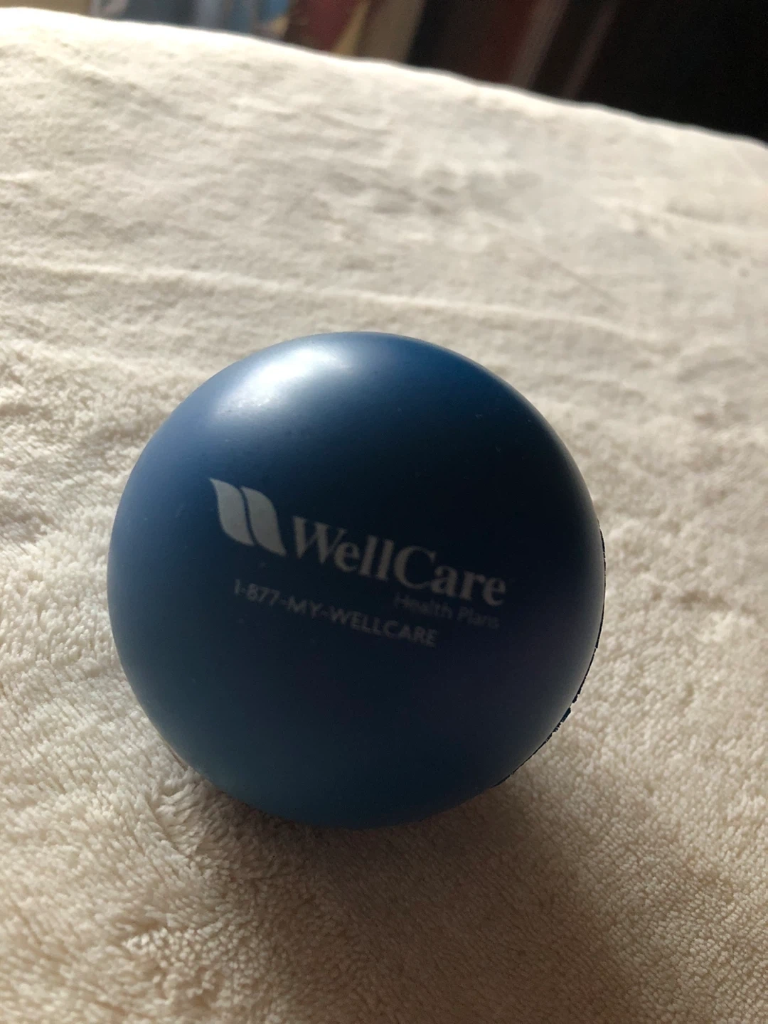 Giving a blue stress ball from WellCare Health Plans. It's in great shape and perfect for relieving stress.