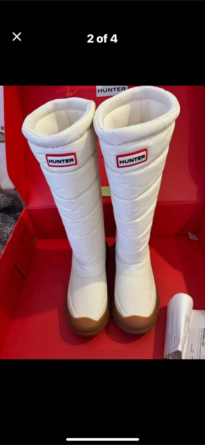 Selling a pair of Hunter snow boots in white, size 6. They come with the original box. These boots are perfect for keeping your feet warm and dry during the winter months!