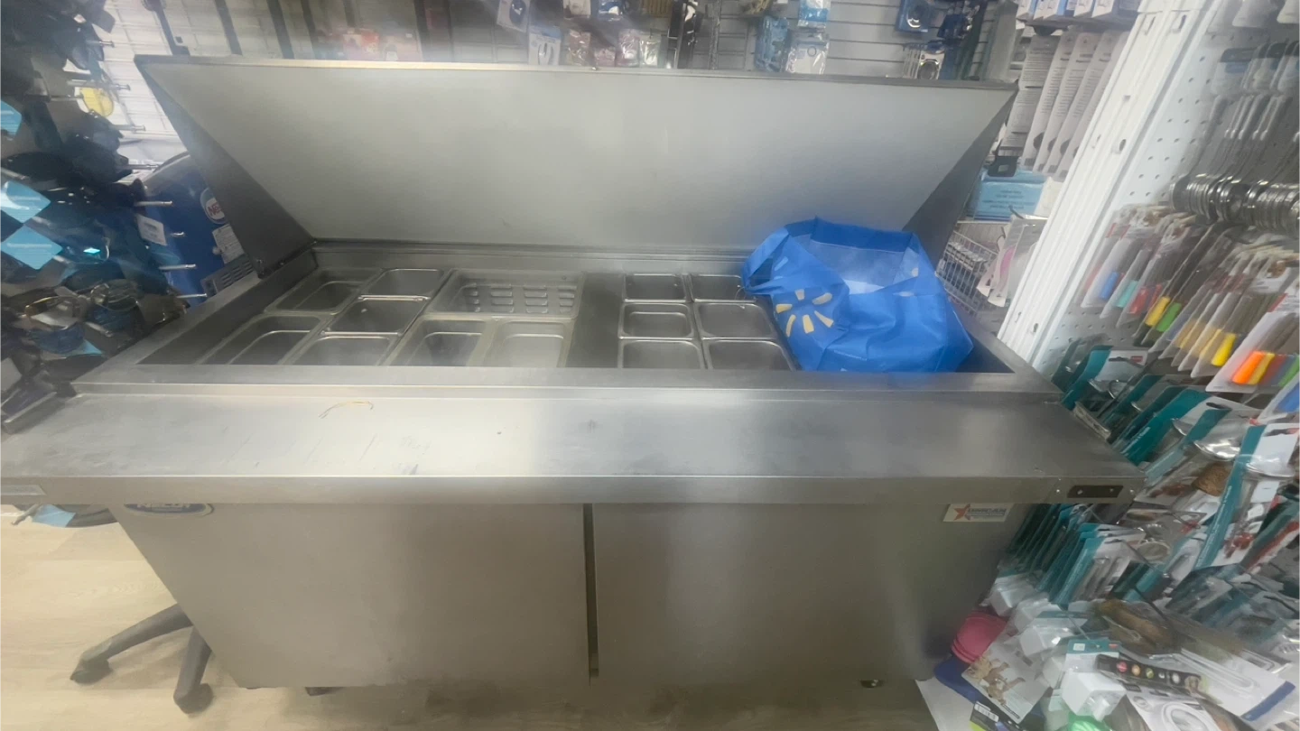 Selling a stainless steel commercial food prep table. It's in good condition and ready for use in your restaurant or catering business. It includes multiple food container slots.