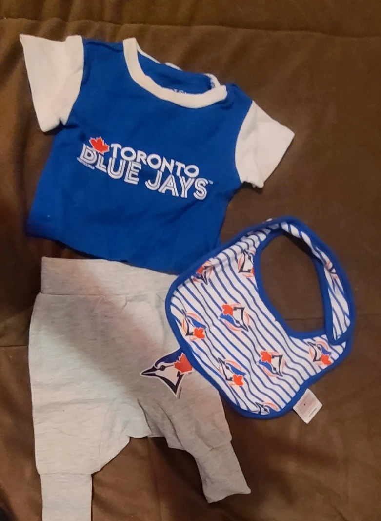 Here's an adorable Toronto Blue Jays baby outfit! It includes a cute t-shirt, pants and a bib. Perfect for your little Jays fan!