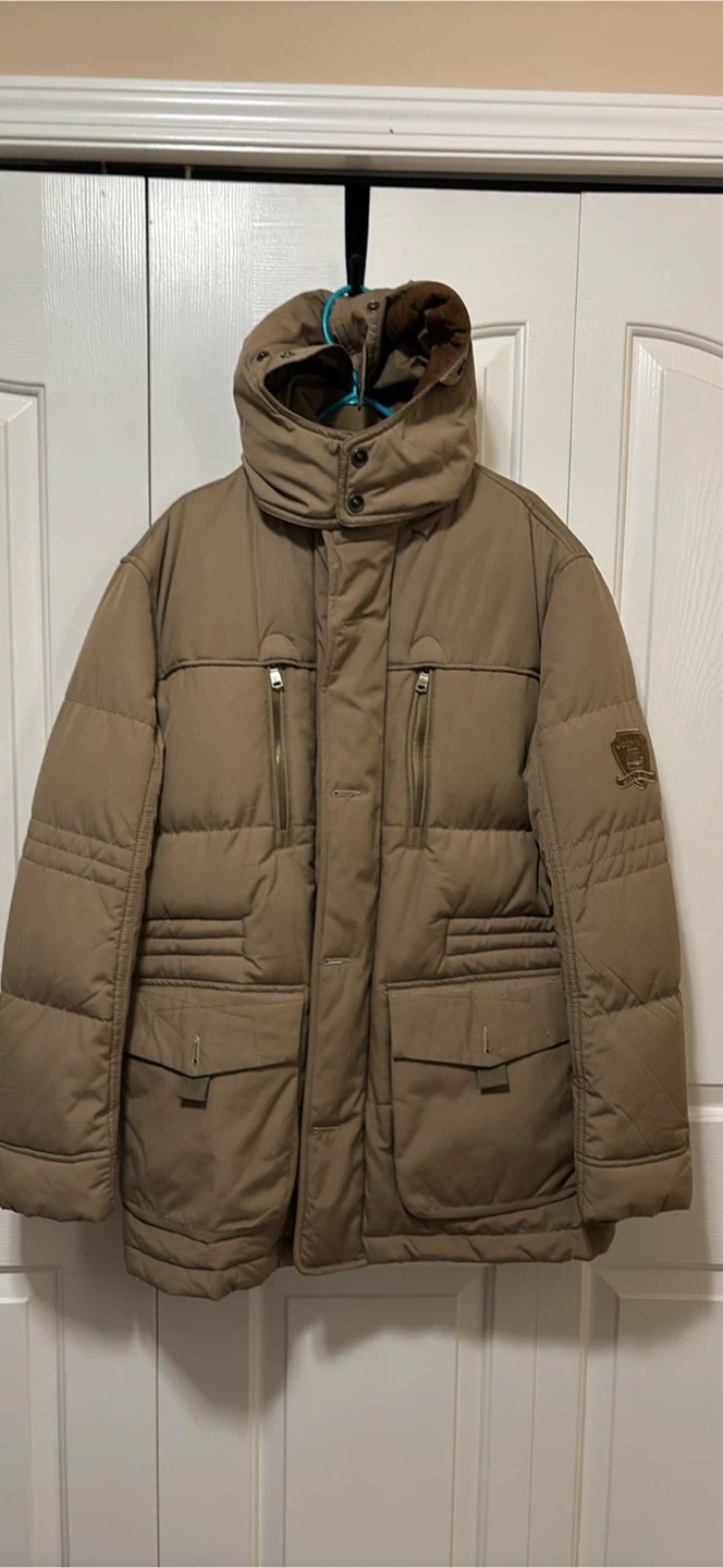 Here's a Moorer down padded jacket in a nice neutral colour! It has a high collar and lots of pockets. Perfect for staying warm this winter.