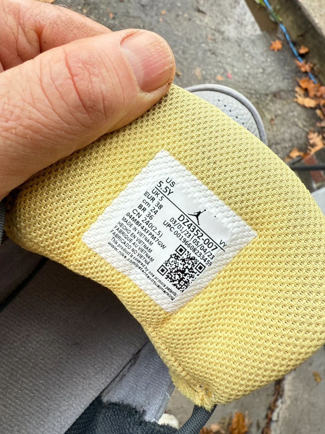 Selling a pair of Jordan Stay Loyal 2 sneakers in grey! They're in great condition and are a youth size 5.5 (US). The manufacturing date is 2023 March 07. Perfect for everyday wear or hitting the court