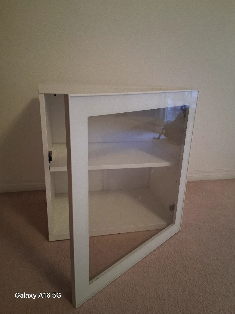 Selling a white cabinet with a glass door. It has two shelves inside, perfect for storage or display.