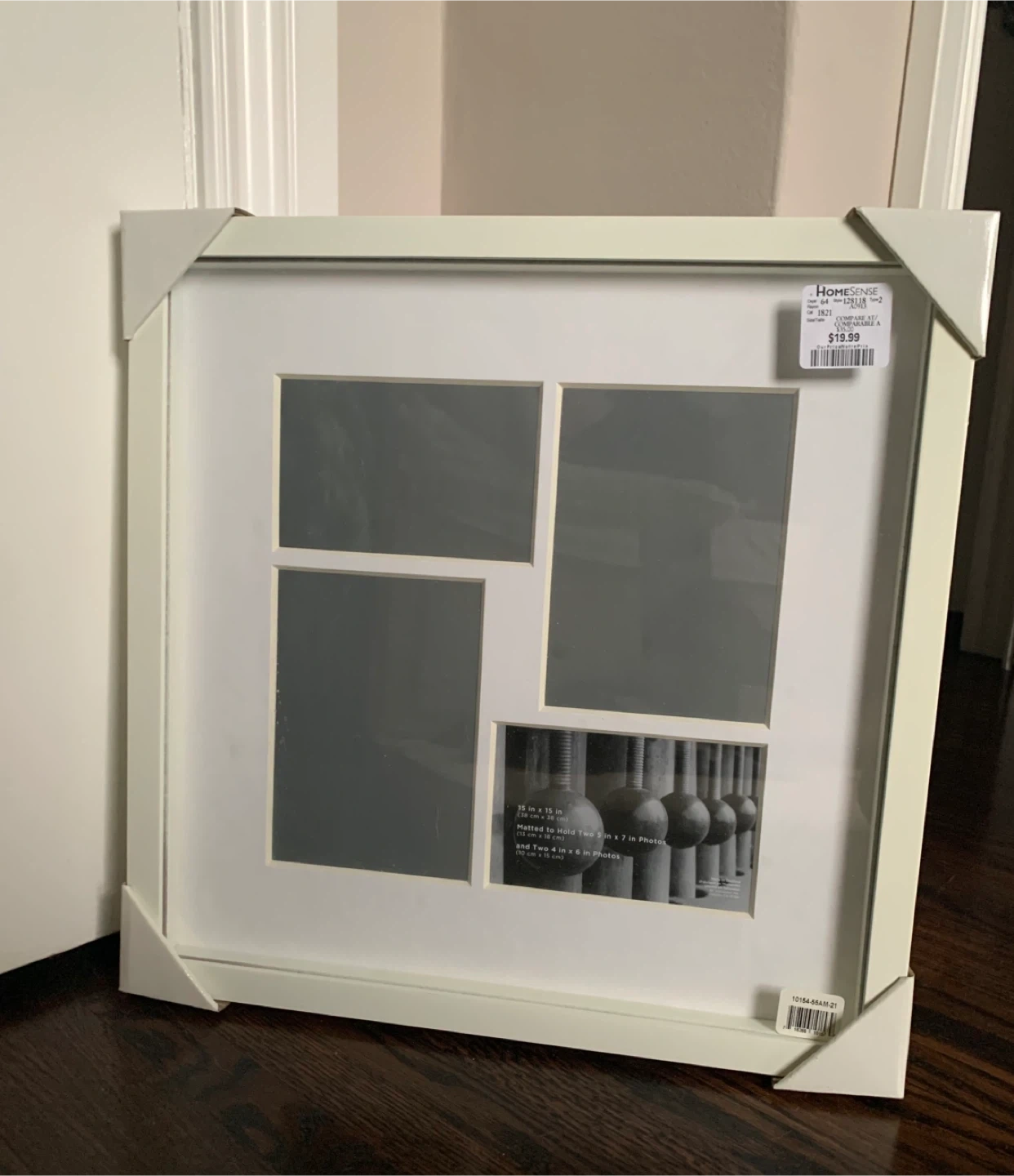 Selling a brand new HomeSense collage wall frame! It's designed to hold two 5x7 inch photos and two 4x6 inch photos. Originally bought for $19.99, it's still in its original packaging and ready to display your favourite memories. Perfect for gifting.