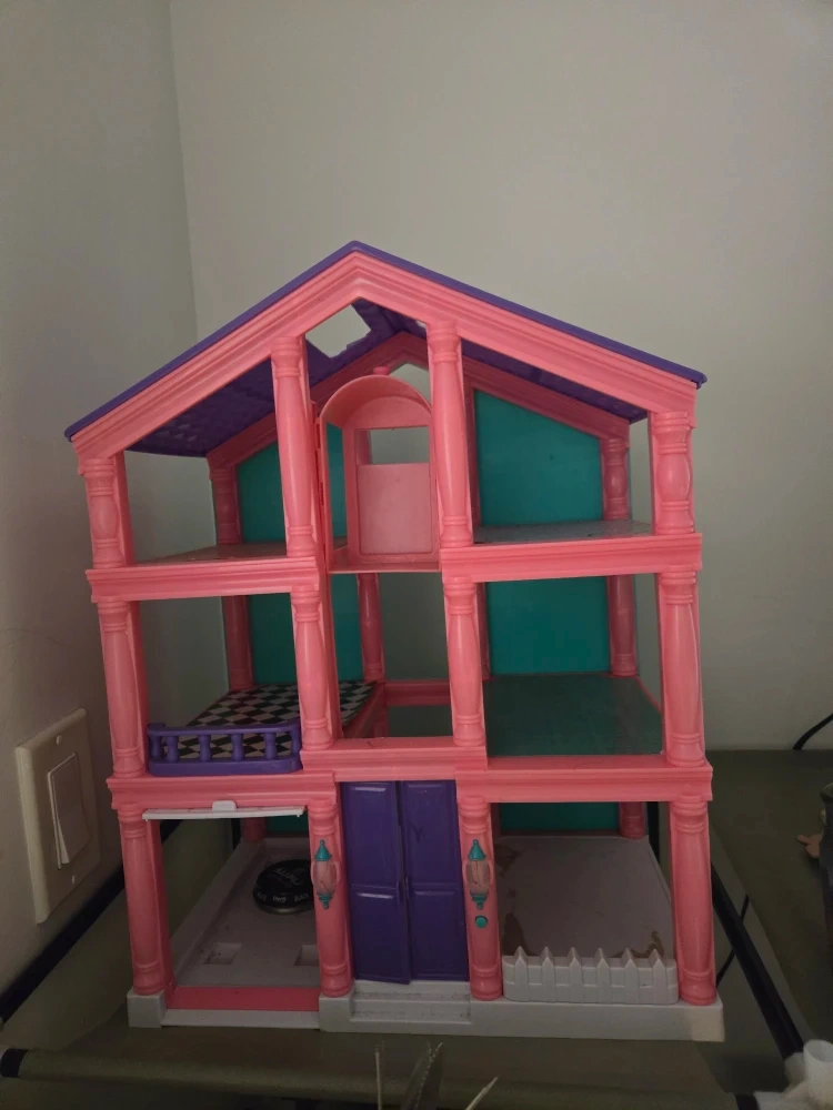 A cute dollhouse with a pink and purple colour scheme! It's in good condition and ready for a new home for your little one's dolls