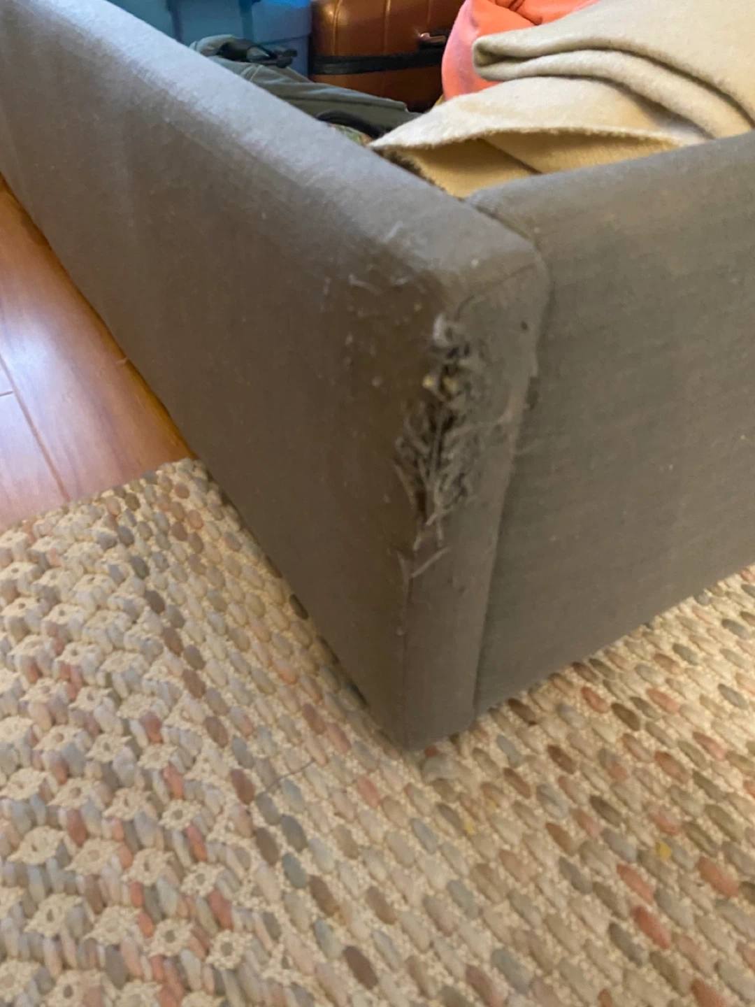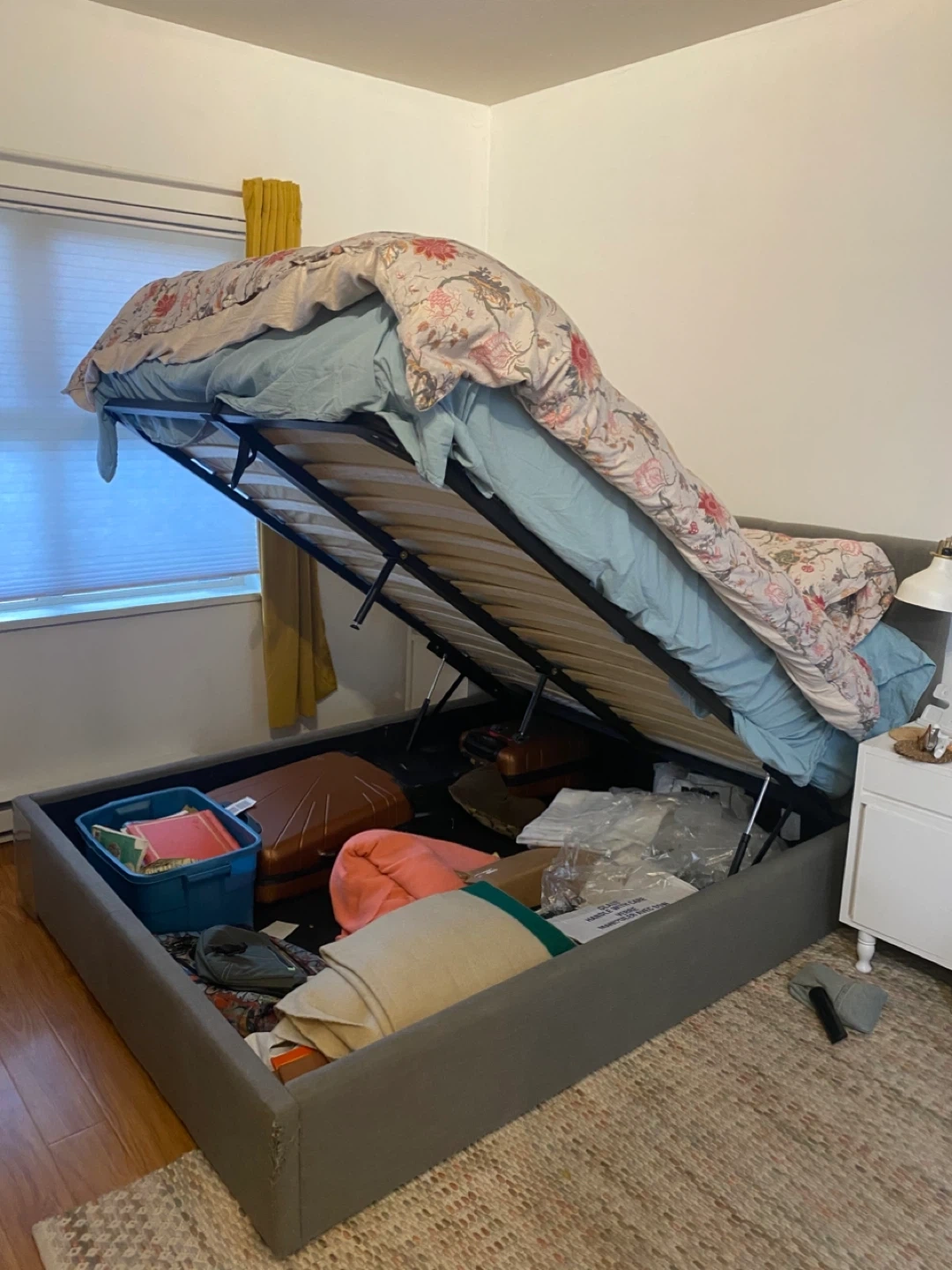 Queen size bed frame with upholstered headboard for sale. It has a grey fabric and a lift-up storage compartment underneath. There is some damage to one corner of the frame.