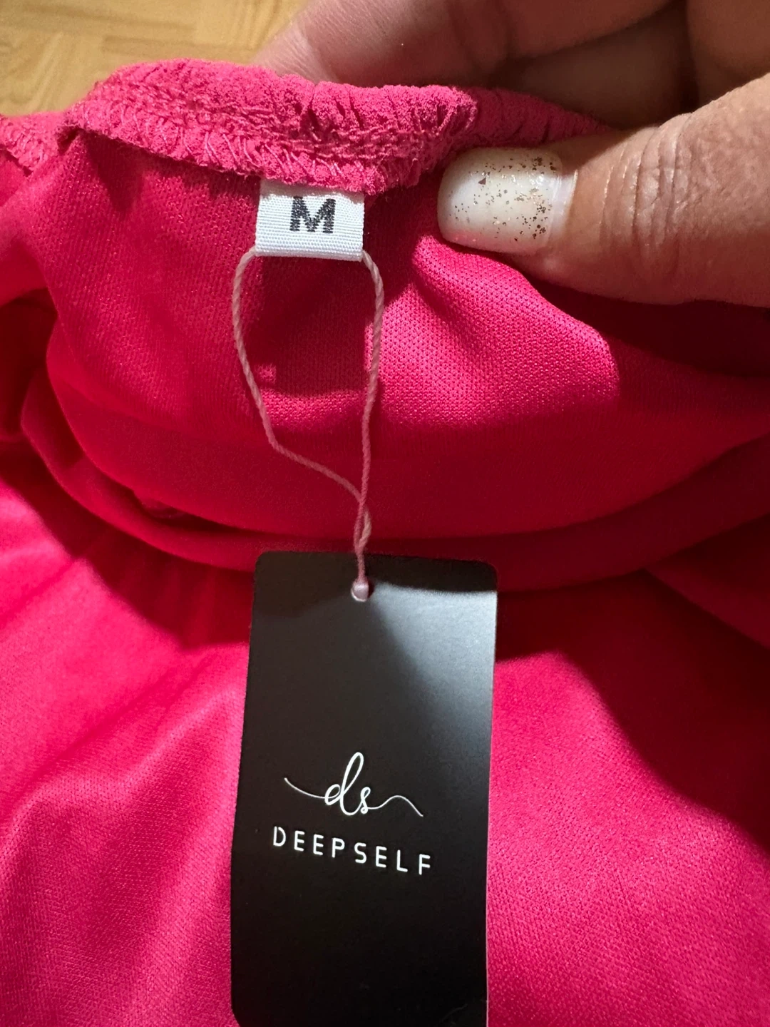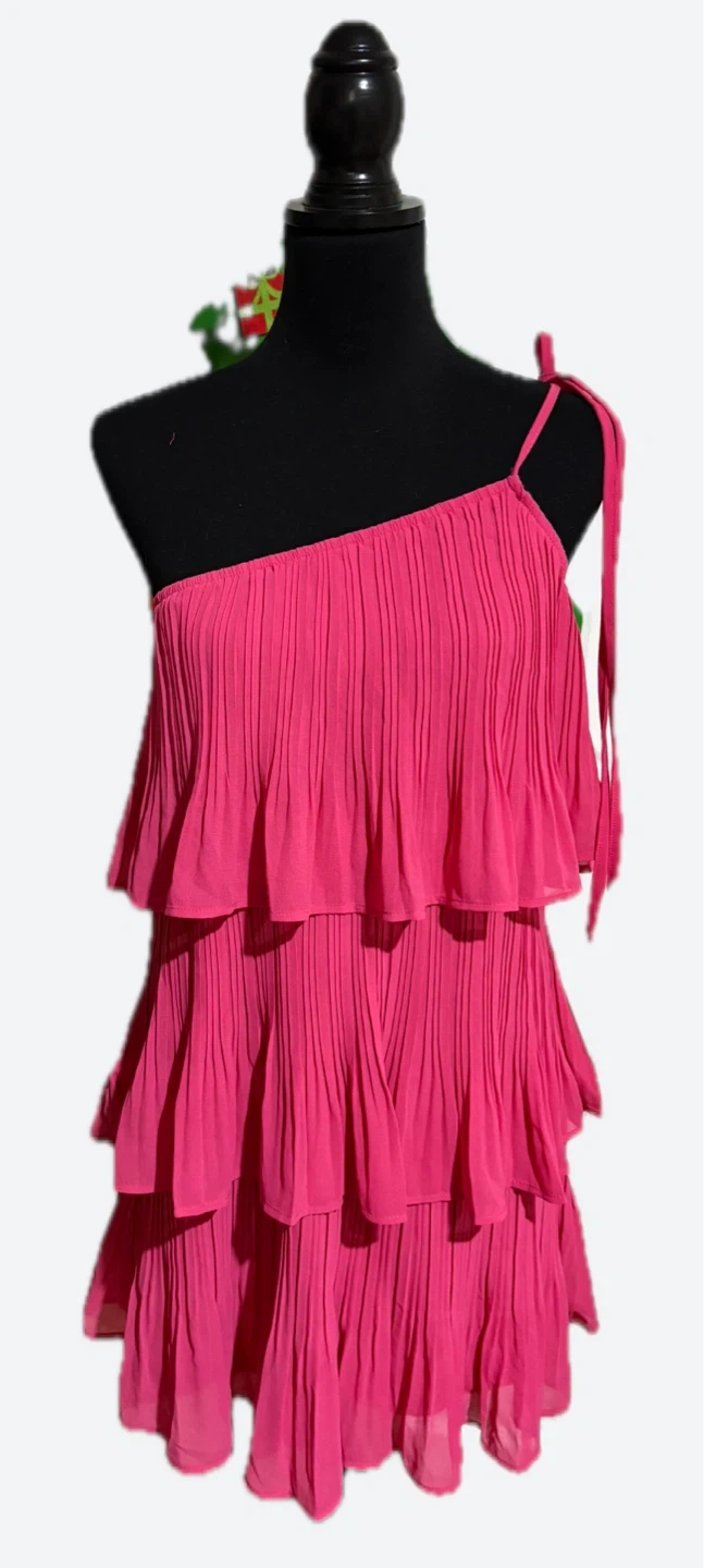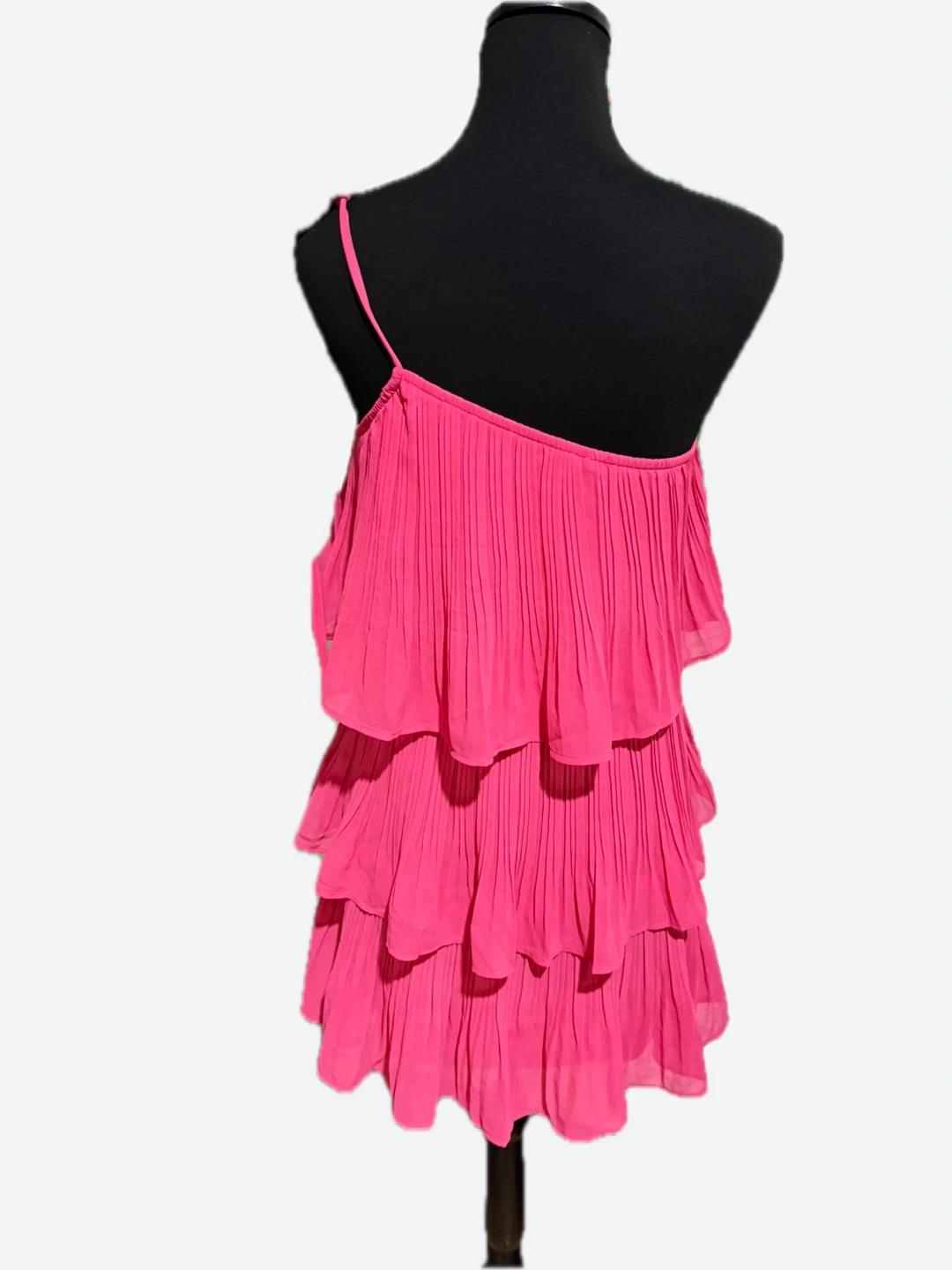 This is a fun and flirty pink tiered one-shoulder dress! It's perfect for a night out or a summer party. The dress is made of a lightweight material and has a flattering silhouette.