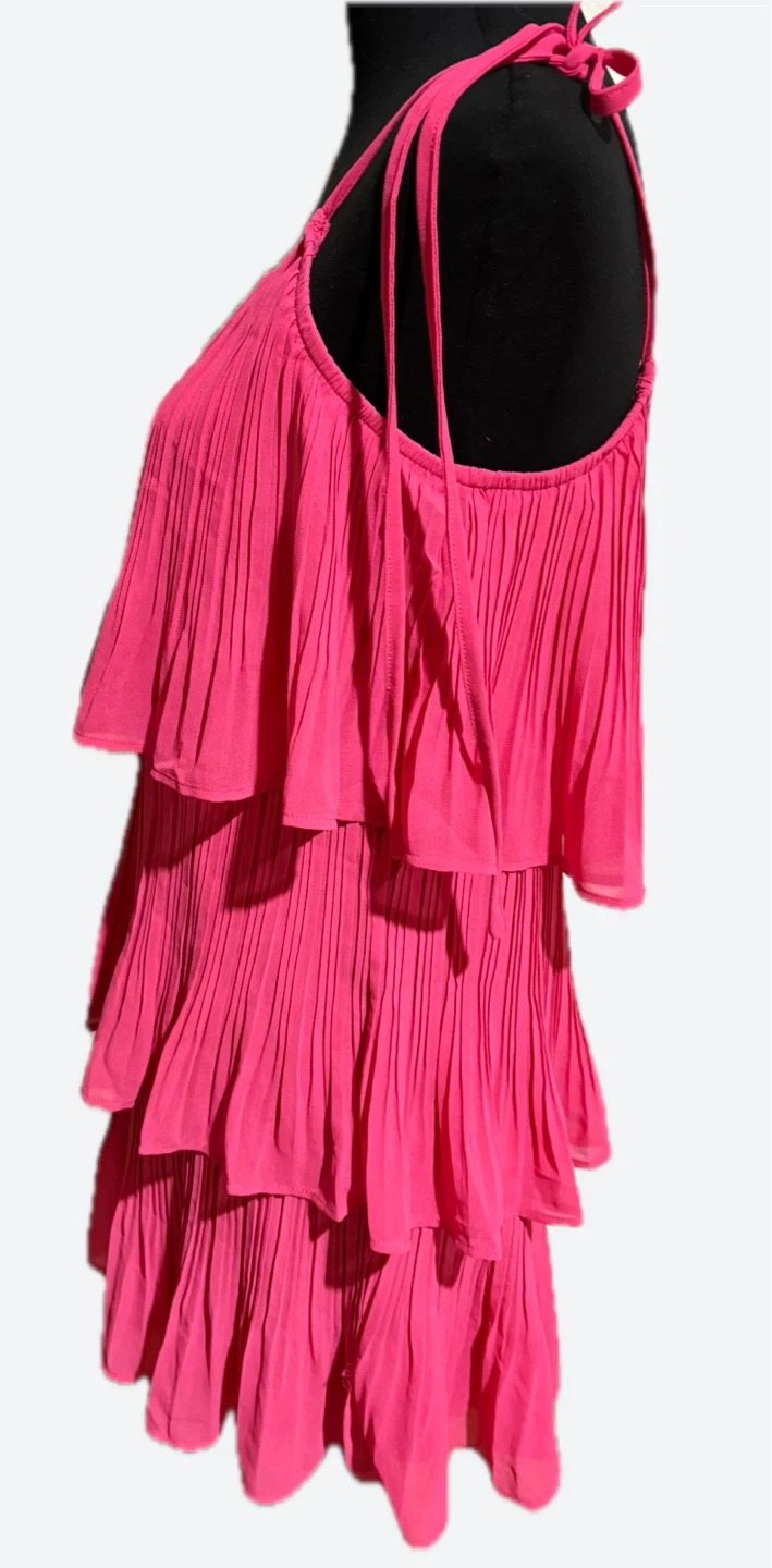 This is a fun and flirty pink tiered one-shoulder dress! It's perfect for a night out or a summer party. The dress is made of a lightweight material and has a flattering silhouette.