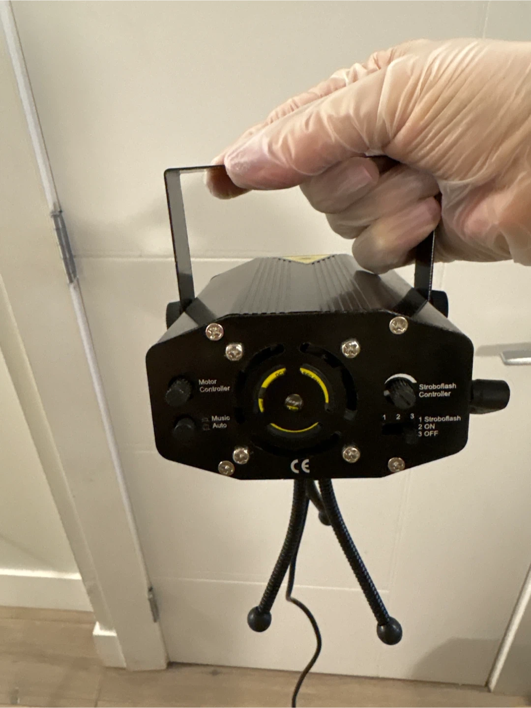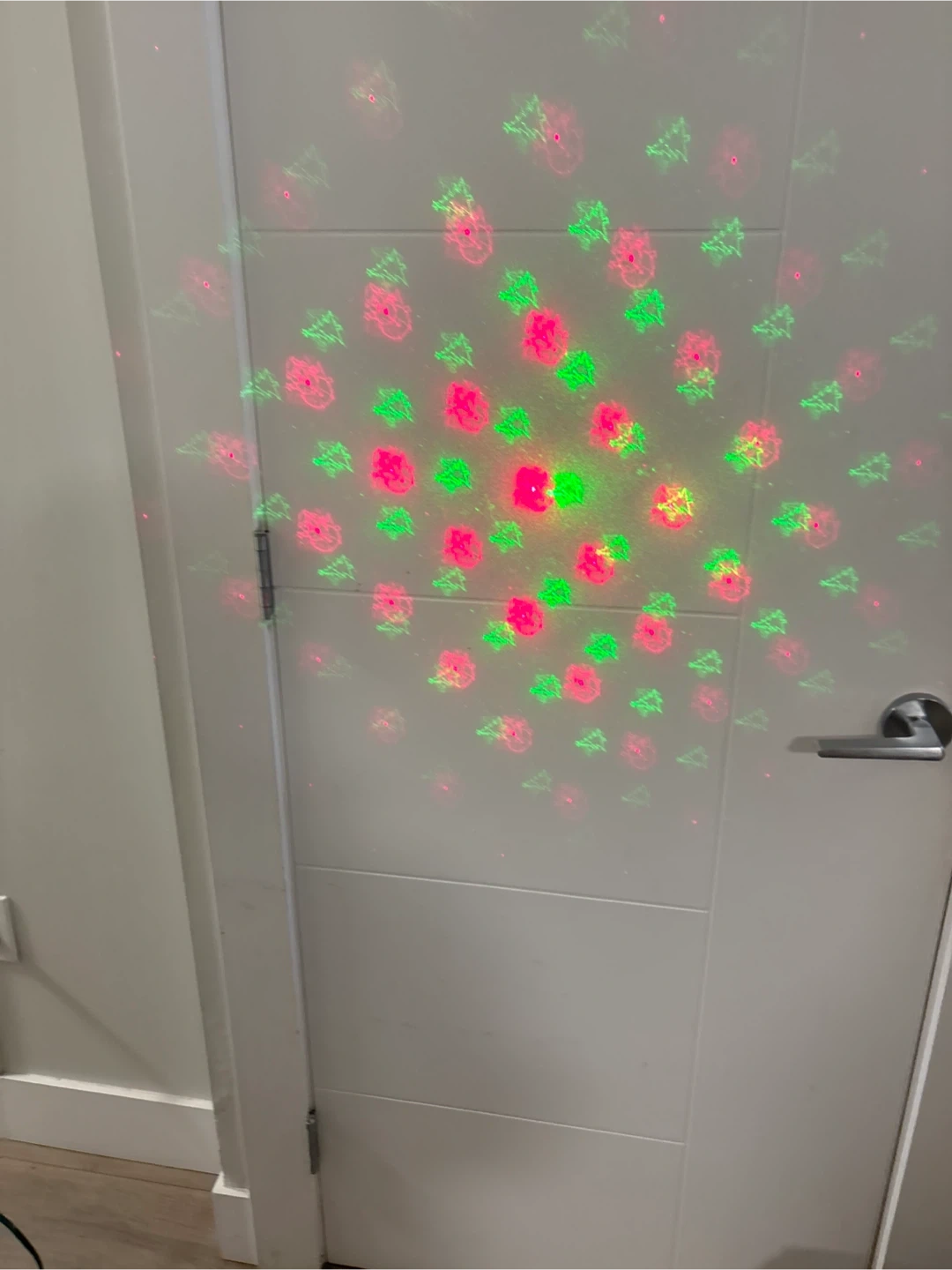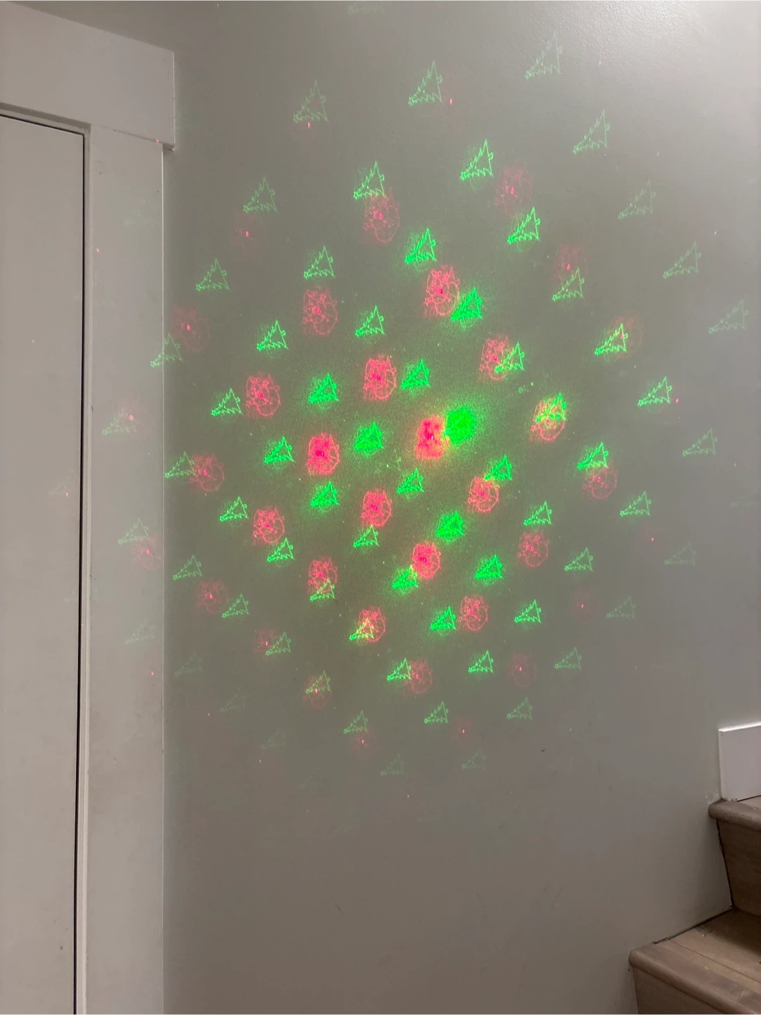 Get ready to light up the holidays with this mini projector! It projects red and green Christmas lights. The box includes the projector, AC power supply, tripod, and instruction sheet inside. The box is included