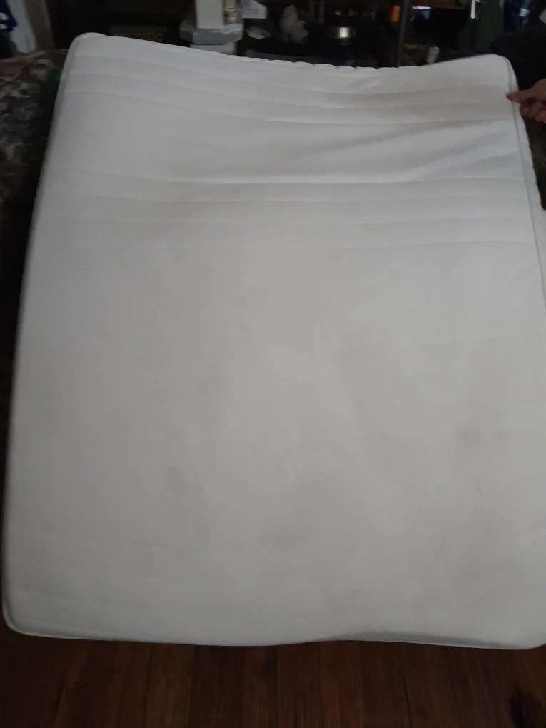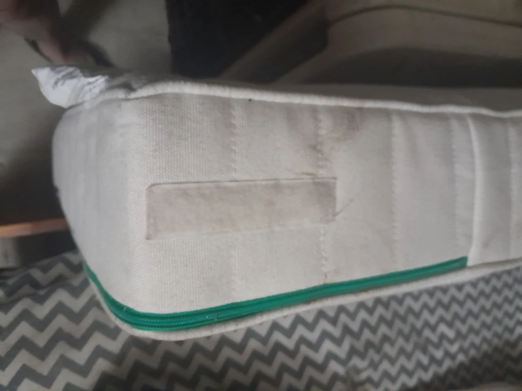 Mattress with some signs of use. Main part is 38 inches x 48 long and 4 1/2 thick. Cover comes off to wash. 2 addition pieces that velco together that are 14 inches wide each. Small good stian on one of the pieces should come out with some stain fighter.