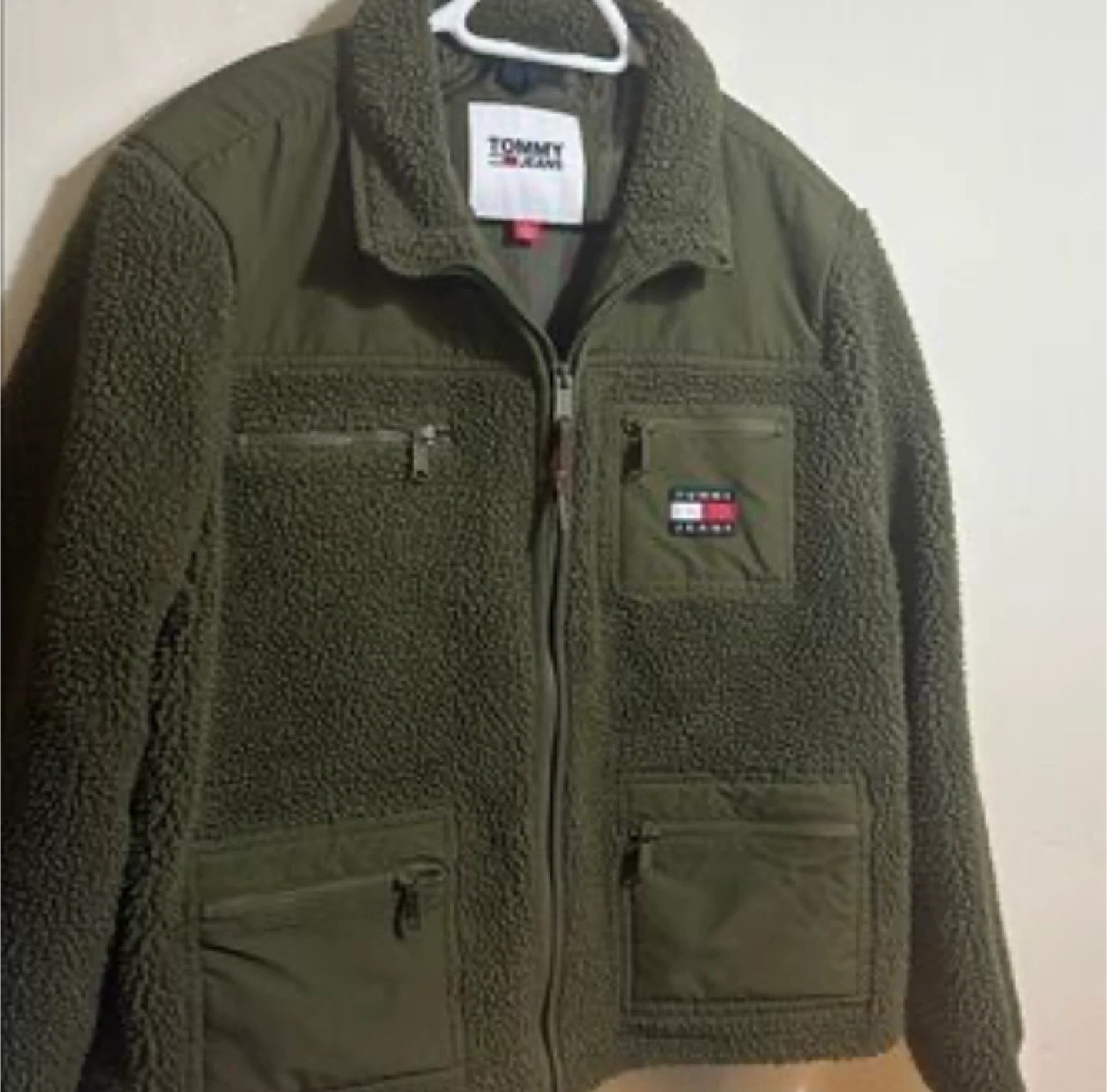 Cozy up with this Tommy Jeans sherpa jacket in a stylish olive green! It's perfect for those chilly days and has a cool, casual vibe. Features a full zip and handy pockets