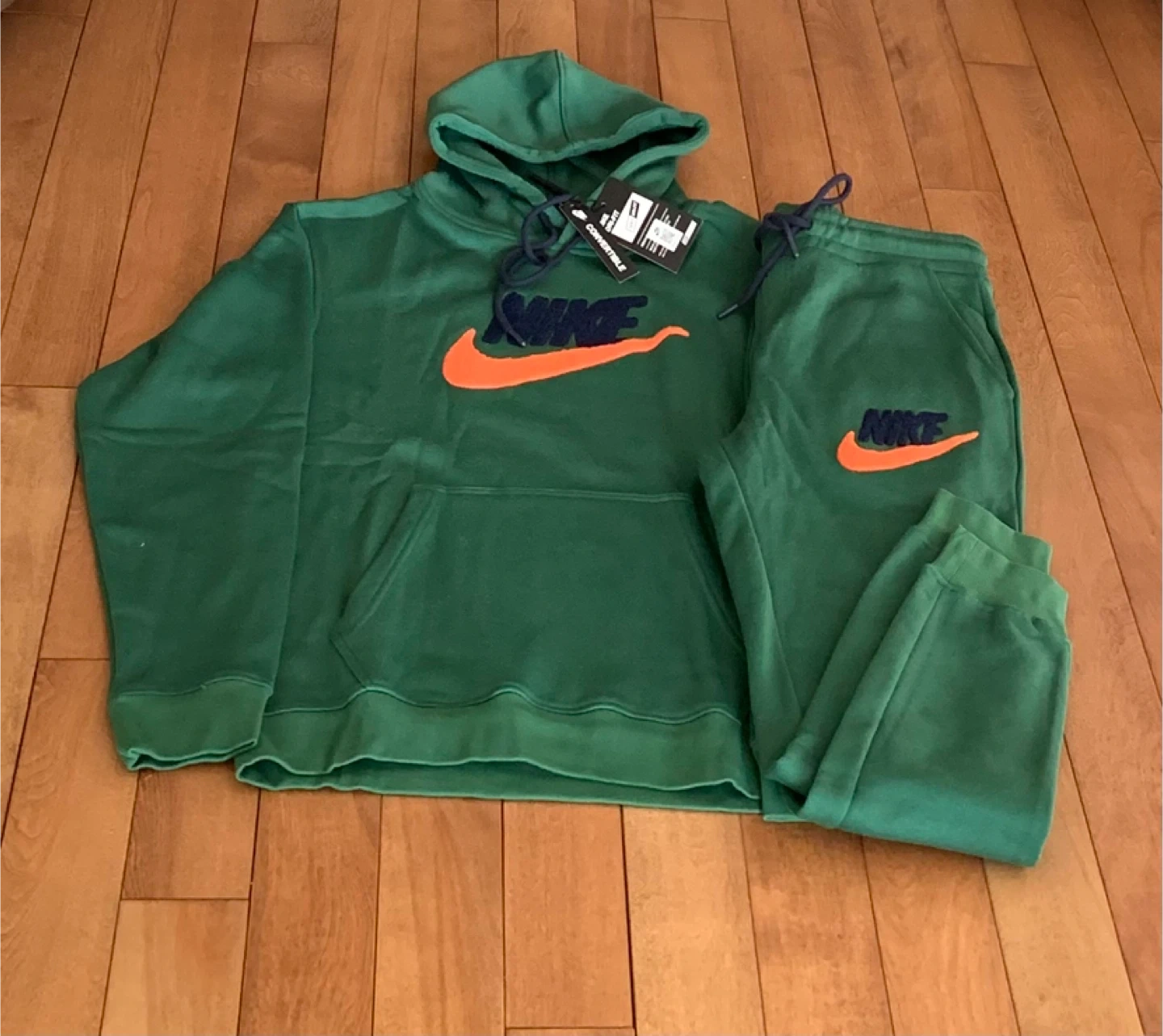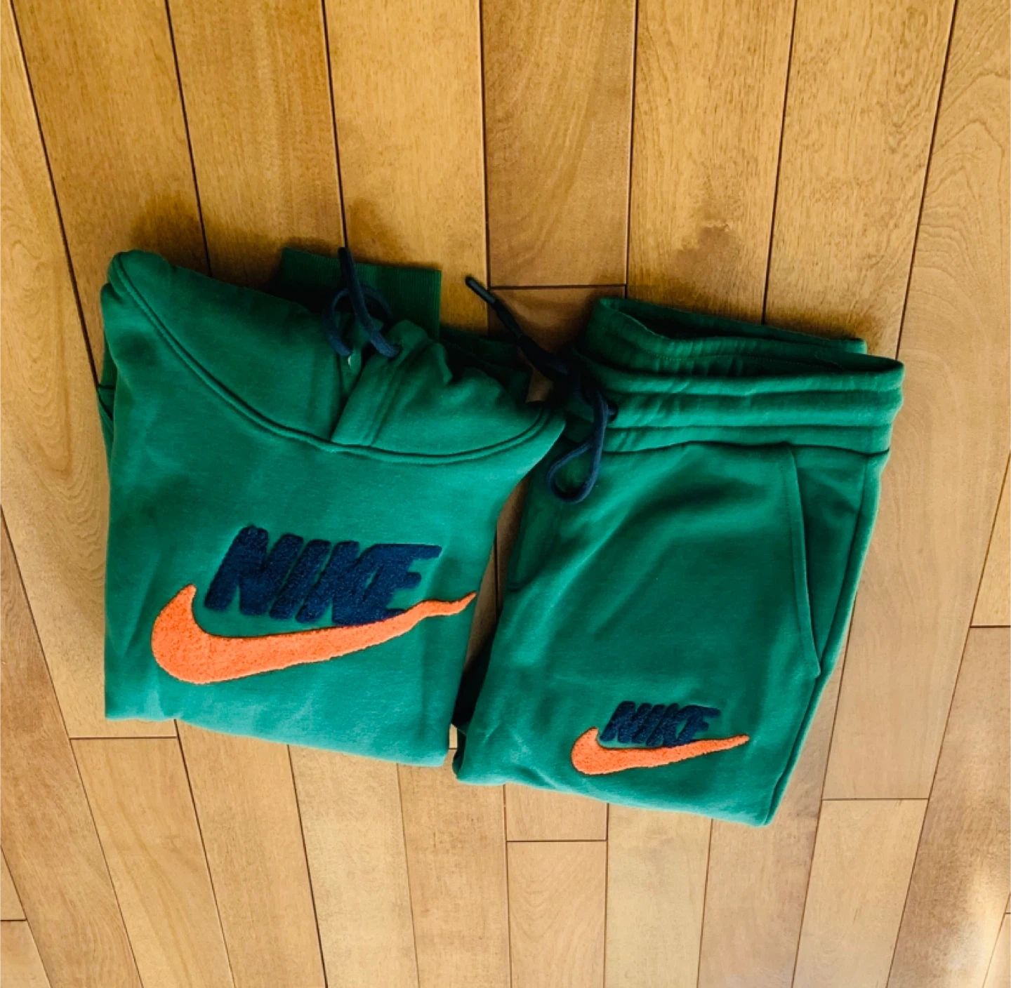 Selling a Nike tracksuit in a vibrant green colour! The set includes a hoodie and matching pants, both in size medium. Perfect for lounging or hitting the gym!
