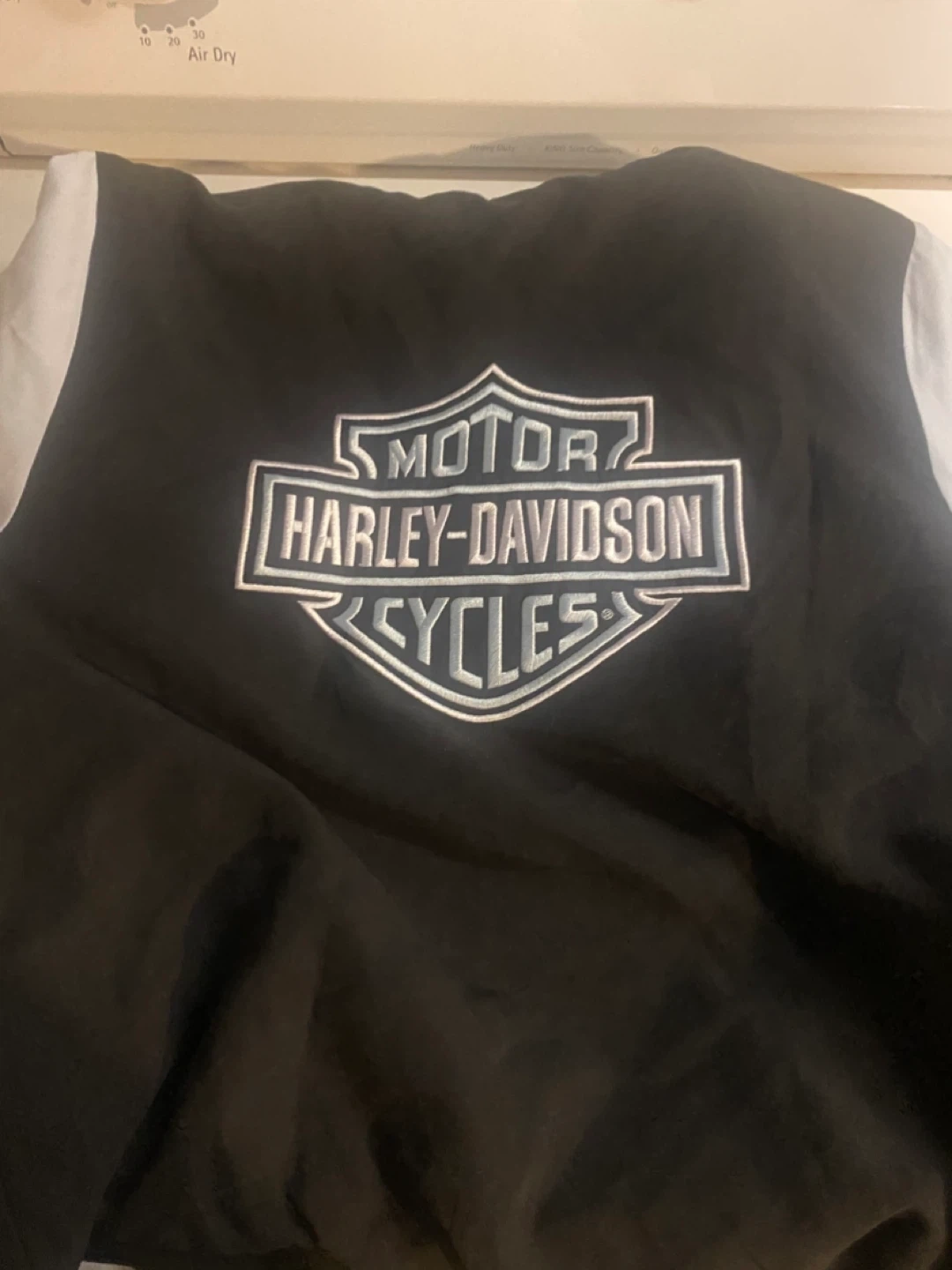 Harley-Davidson varsity jacket in black and white. It features the Harley-Davidson logo on the back and 'Harley' across the front. Great for any Harley fan!