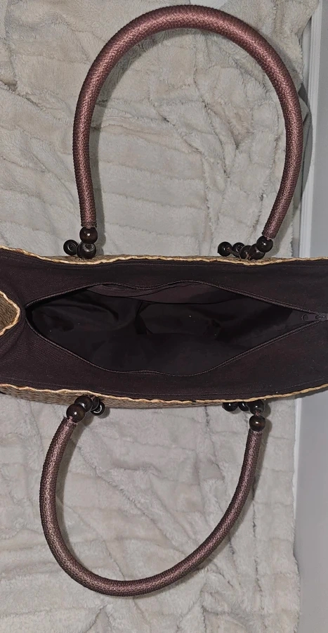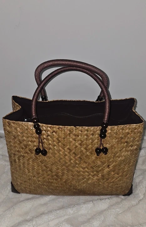 Selling a brand new, handmade, classy woven straw tote bag! It features elegant brown handles with bead accents and a dark brown fabric lining. Perfect for summer, your next beach vacation, or even as stylish laptop storage 💻