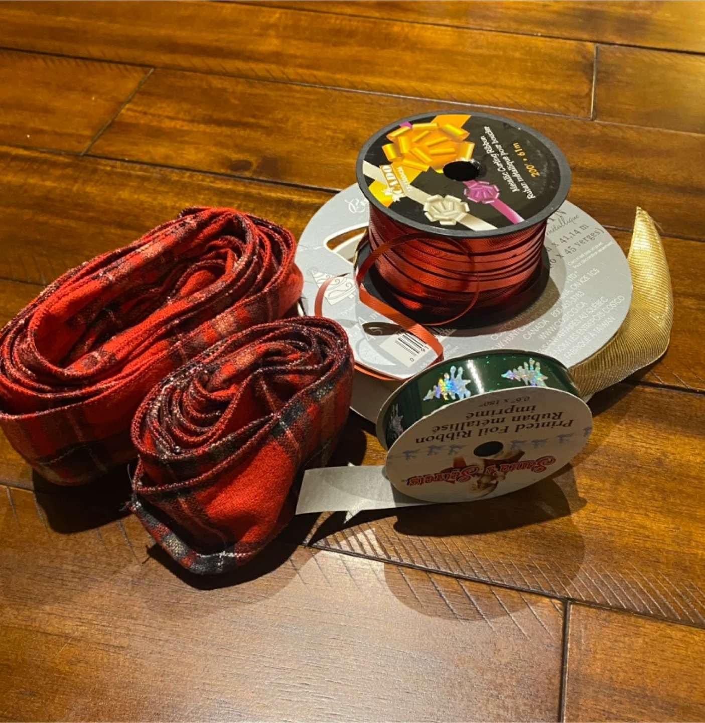 Selling a variety of ribbon rolls! There's a red plaid fabric ribbon, a metallic curling ribbon, and a printed foil ribbon from Santa's Secrets. Perfect for all your gift wrapping and crafting needs